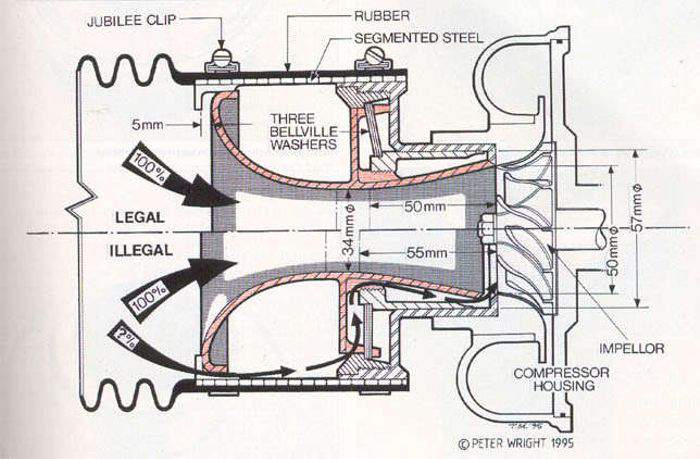 Vymontovaný díl sání sice vypadal naprosto normálně, avšak jeho geometrie se při namontování zásadně změnila. Aby trychtýř odolával tlaku proudícího vzduchu, musel být na zúžené části vzepřen sadou talířových pružin. Jenže po namontování na přírubu turbodmychadla se pružiny zdeformovaly a odtlačily trychtýř o 5mm, což odkrylo nový kanál sání. Dodnes se neví, jak FIA podvod odhalila. Některé zdroje obviňují podlé udání, jiné poukazují na nápadně vyleštěné povrchy zmíněných pružin, které naznačovaly, že kolem má proudit vzduch. Jistě však víme, že skvělé výsledky v roce 1995 byly anulovány a tovární tým měl zakázanou účast i v následujícím roce 1996, což byl poslední ročník dle pravidel homologační skupiny A. Nadále měly být vrcholní predátoři rallye známi pod zkratkou WRC, ale o nich si povíme zase někdy jindy.