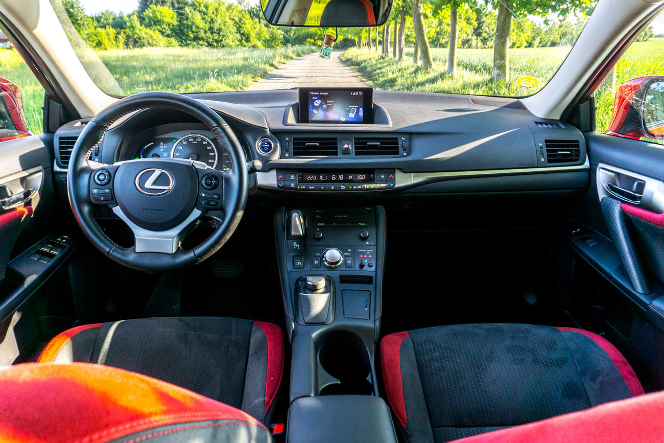 V testovaném voze interiér svými červenými akcenty ladil s lakem karoserie, červené detaily navíc pozvedly trochu usedlejší tvary na vyšší úroveň. Po praktické stránce potom k Lexusu nemám výhrad. Interiér je prostorný, sedadla pohodlná (jejich vyhřívání má 29 úrovní. Skutečně. 29!), všechno je tak, jak bych si to asi tak představoval. Malé rozčarování přišlo s pohledem pod páté dveře. Stylový prémiový hatchback nikdy neměl ambice stát se nějakým stěhovákem, i přesto se však zavazadelník jeví až příliš plochý a malý. Říkal jsem si, že je to patrně cena za balík baterií hybridního pohonu a s myšlenkou ‘sestimsmiř’ jsem se už už chystal kufr zavřít a zapomenout, že tu vůbec je. Ale než jsem to udělal, nakoukl jsem pod podlážku. A světe div se - tu je druhý zavazadelník a je téměř stejně velký, jako ten nad podlážkou. Pokud se ptáte, proč v Lexusu rozdělili zavazadlový prostor ve dví, pak vězte, že vážně nemám tušení. Pod podlážku se však vejdou i dva kufříky velikosti ‘příruční zavazadlo’, celková přepravní kapacita Lexusu je tak navzdory prvnímu dojmu dostačující.