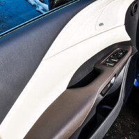 Tomu zcela jistě nahrává i krásná kombinace tmavě modré metalízy ve spojení se světlou pískovcovou kůží a bambusovým dřevem. Tmavě modrá barva krásně procitne na světle a neudělá ostudu vůbec nikde. V interiéru zase někdo očividně přemýšlel – světlé jsou pouze plochy, které se nešpiní, tedy pouze sedačky a vrchní část interiéru, tmavě hnědá kůže zase ozvláštní opěradla na dveřích a čalounění středového tunelu.