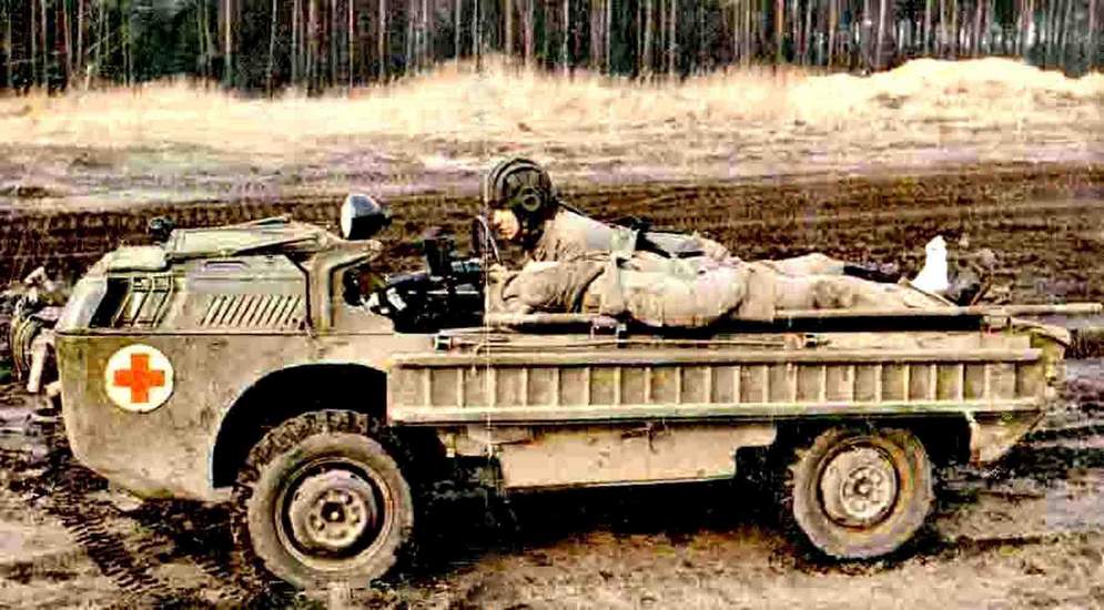 Naprostou katastrofou pak skončilo zamýšlené bojové využití frontové ambulance. Sloupek řízení byl pro tento účel sklopný do vodorovné pozice. Řidič pak ležel na sedačce na břiše s volantem před sebou. Ovládání pedálů plynu a brzd dlaněmi bylo přinejmenším krkolomné. Motorový prostor, přes který nebylo z ležící pozice vidět, pak měl sloužit jako ochrana před střelbou z ručních zbraní. Na boku vozu zavěšené nájezdové rampy bylo možno vyklopit vzhůru a chránit tak ležícího řidiče ze stran. Z fotografií z armádních testů je jasné, že být řidičem frontové ambulance v šedesátých letech bylo povolání nelehké. Skutečná balistická ochrana lisovaných plechů je přinejlepším diskutabilní, reálně pak zamýšlené bariéry napáchají více škody, než užitku. Pokud se však medik i přes nepřízeň konstrukce přiblížil k raněnému, měl po něm hodit navijákové lano a odtáhnout ho mimo střelbu. Po aplikaci první pomoci měli být až dva ranění naloženi na boky vozidla a odvezeni z bezprostředního ohrožení. Bohužel vlivem malých rozměrů vozu a naprosté absence stěn měli takto převážení ranění tendenci přepadávat přes nízkou hranu a předčasně tak opouštět vozidlo při přejezdu drobných nerovností.