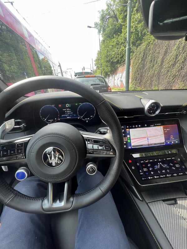 Ani v interiéru nepřichází zklamání. Na co sáhnete, to působí velmi bytelně a poctivě. Interiér je plný kvalitní pravé kůže, tak jak to má v Maserati být. Velká hliniková pádla pod volantem jsou uchycena na sloupku řízení, takže při svižnější jízdě a natočeném volantu stále víte bez přemýšlení a hledání, za které pádlo zatáhnout pro další kvalt. Drobnou výtku mám k tlačítkům na řazení, které najdete mezi dvěmi středovými displeji. Působí trochu méně kvalitně než ostatní tlačítka a je třeba je zmáčknout docela dost, aby auto opravdu zařadilo jiný režim převodovky, ale je to nejspíš o zvyku. Osobně mě trochu mrzí absence analogových hodin, které jsou nahrazeny displejem. Jde sice přepnout do režimu G-metru či stopek nebo změnit vzhled hodin, přesto na mě digitální hodiny v takovém autě působí trochu lacině a klasika by se sem hodila víc. Velmi příjemně překvapí, že na zadní sedačky můžete usadit dospělé lidi. Za mne si teda na sedadle za řidičem nikdo moc nesedne, ale ve třech se dá v pohodě cestovat i dál než do Pařížské pro novou kabelku. Zvláštním prvkem se na první pohled může zdát otevírání dveří na tlačítko, ale upřímně po chvilce na to úplně zapomenete a klasická klika se zdá jako přežitek, navíc je tlačítko umístěné celkem intuitivně u madla dveří. Pochválit musím Maserati za jejich přístup k ambientnímu osvětlení. Nenajdete tu žádnou růžovou ani jinou barvu, tady nejste na kolotočích! Jednoduše si můžete vybrat ze tří různých teplot bílé, která řidiče neruší při řízení a jen dokresluje atmosféru na palubě. Takhle má vypadat luxus..