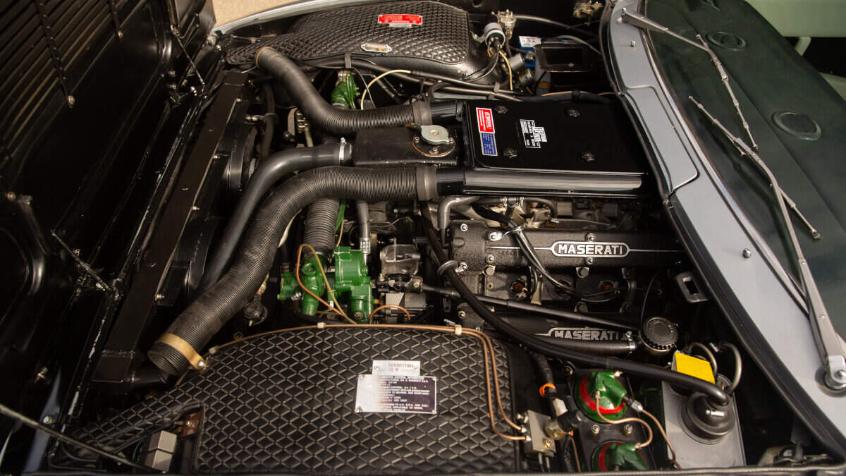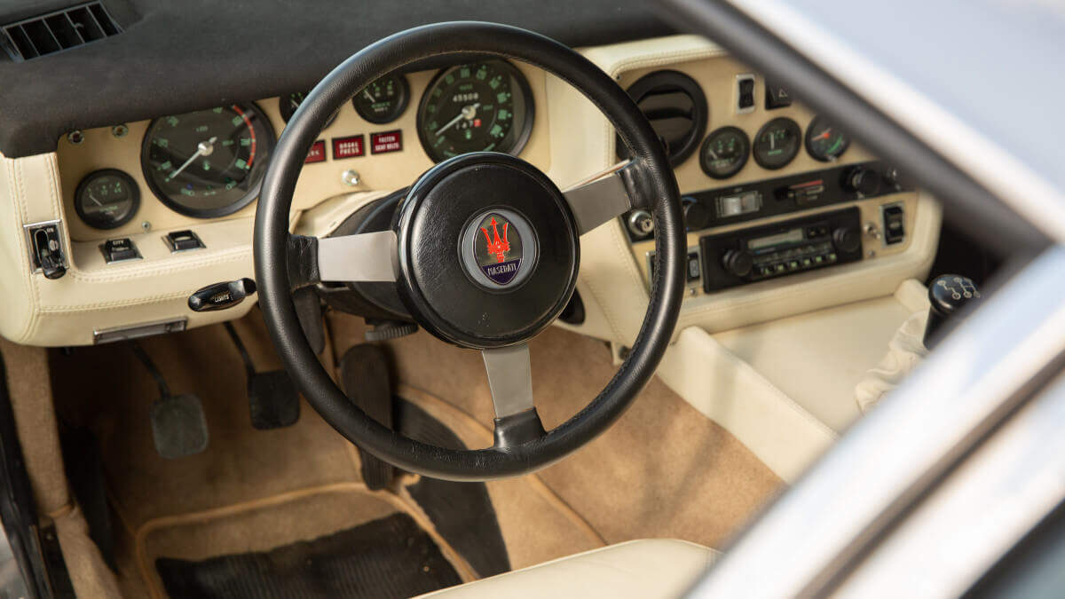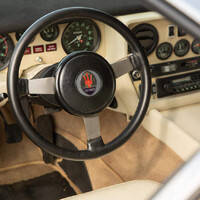 Ani interiér nezůstává pozadu a je hoden značky Maserati. S materiály je to snadné – všude vládne nejjemnější kůže až na vršek přístrojové desky a detaily kolem budíků, kde se zabydlel semiš (dnes bychom řekli spíš alcantara). Dominantou interiéru, když pominu spoustu krásných detailů, je především velmi široký středový tunel, který si vynutila koncepce pohonu – motor uprostřed celý za přední nápravou a pohon zadních kol. Řidič bude ale svou pozornost spíše věnovat pěkně robustnímu a kulatému volantu, pod kterým uvidí filigránsky zpracované kruhové ukazatele na přístrojové desce. Snad jediné co trochu nemile překvapí, jsou odhalené šrouby vedle nich.