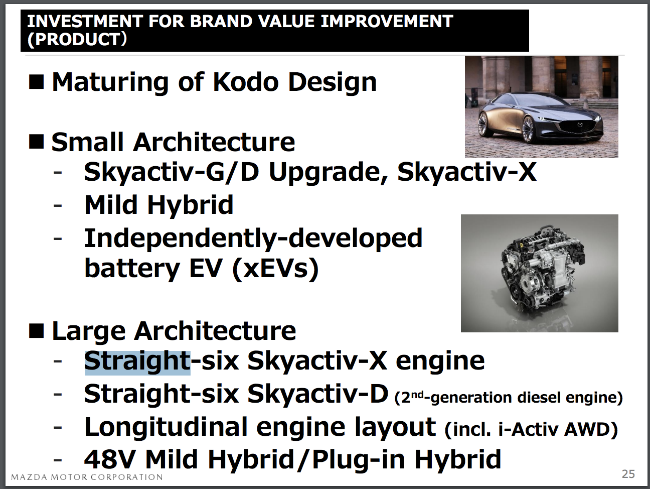 Poslední Mazdou, pod jejíž kapotou jsme mohli naleznout šestiválcový motor, byla první generace velkého SUV CX-9. Ta se však odporoučela do důchodu v roce 2015 a od té doby nabízí hirošimská automobilka své modely pouze se čtyřválci. Možná si někteří ještě pamatujete na výroky předních představitelů značky, kterak už žádné velké motory nemáme očekávat, protože jim doba nepřeje. Nicméně uběhly 4 roky a vypadá to, že všechno je jinak. Před pár dny proběhla účetní uzávěrka loňského roku, a právě na ní byl akcionářům odprezentován plán budoucího vývoje. Velmi zajímavý plán, nutno podoktnout.
