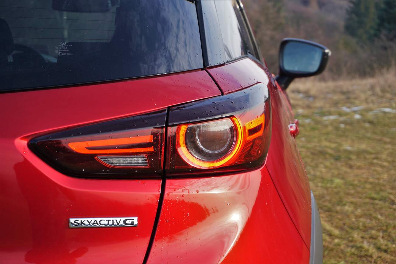 Designově CX-3 asi ničím nepřekvapí. Za prvé je na trhu šest let a za druhé vypadá prostě jako Mazda. Úzké světlomety a rozesmátá maska chladiče jsou jasné poznávací znamení. A kdybyste si přece jenom nebyli jisti, metalíza Soul Red Crystal nenechá nikoho na pochybách, o jakou značku se jedná. CX-3 je prostě takový malý a nazvedaný hatchback, který asi do kolen nikoho neposadí, ale druhou stranu ani neudělá ostudu. A to může stačit.
