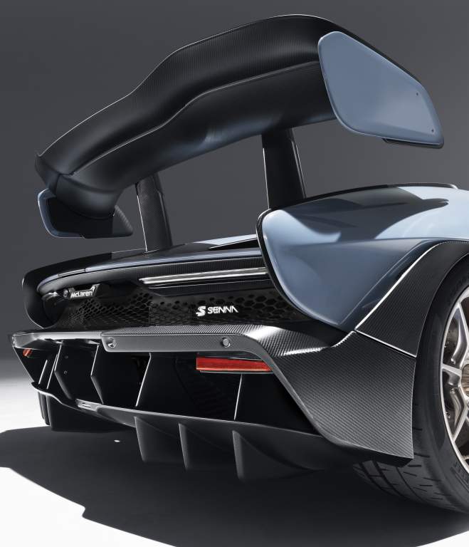 Křídlo na zádi vozu nepobralo příliš krásy, stejně jako nestydatý difuzor. Výsledkem však je maximální přítlak až 800 kg, který Senna dosahuje při rychlosti 250 km/h. Jen samo křídlo vážící 4,87 kg dokáže tlačit auto k silnici více než stonásobkem své vlastní váhy. Aerodynamika je aktivní. Dvojice klapek pod každou z předních lamp mění polohu společně s aktivními plochami křídla. Tím je upravována aerodynamická rovnováha například při brzdění, kdy se hmota přesouvá na přední část aut. Zmenšením úhlu náběhu předních klapek a naopak zvýšením aktivní plochy křídla se aerodynamická rovnováha posune více vzad a umožní intenzivnější a agresivnější brzdění bez efektu nadlehčené zádě. Aktivní prvky samozřejmě pomůžou při dosahování maximální rychlosti 340 km/h, kdy negenerují nevyžádané množství přítlaku.