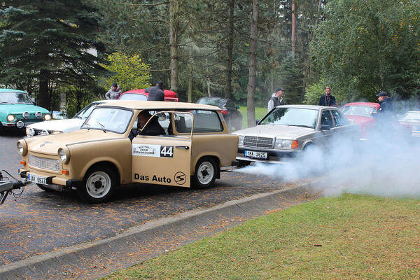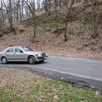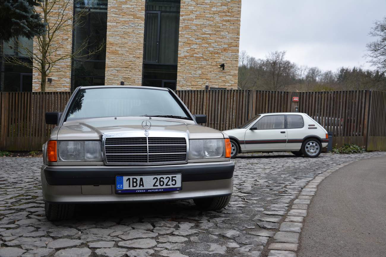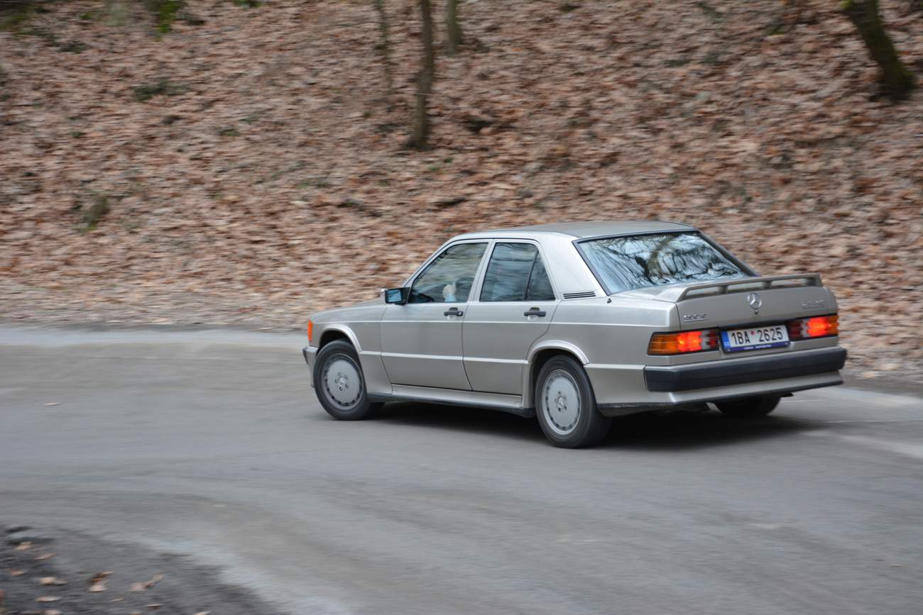 Olej se nám už ohřál na devadesát stupňů, zatímco jsem se tu zakecal v historii a můžu na to konečně šlápnout. Přímým tahem řadící páky dlouze a rozhodně podřazuji s meziplynem na dvojku a otáčky se zvedají přes čtyřku. Zvuk se probarvuje a stále v klidném vyváženém chodu se čtyřválec rozezpívá vstříc těm ostřeji naladěným vačkám. Motory Honda umí být podobné. Ale jsou příliš technicky dokonalé. Tohle je taková poctivá masitá síla, která mě žene kupředu. Těsně před sedmi tisíci otáčkami řadím rozhodně, ale neuspěchaně zase trojku. Tohle je koncert klasických tónů, automobilový Pink Floyd. Někdy mám náladu si zařádit na okresce s něčím zběsilým. Umělé tóny a naprogramované práskání a kašlání do výfuku mi vytváří dojem, že jsem na rychlostní zkoušce rallye. Někdy si naopak jen chci sednout, vychutnat dobrou sklenku vína a pustit Rogera Waterse a Davida Gilmoura. A ta bílá krabička, ten Peugeot 205 GTI je mi stále za zadkem. Pak přicházejí zatáčky a klesání do malebného údolí v obci Podkozí a já zjišťuji, jak obratně se s Mercedesem zatáčí. Fakt se těším na cestu zpět nahoru. Je to tam trochu nasmrkané a dost písku zbylém po posledním zimním posypu. Ayrton Senna na té GP trati jezdil hodně bokem. To je z videa evidentně vidět. Pavel říká, že i díky nivoregulaci zadní nápravy je auto až příliš klidné a vyžaduje fakt velkou dávku hulvátství a zdravé, velké koule ho poslat někam opravdu bokem. Jedeme zpět nahoru a já cítím, že to není zas tak těžké. Nepřetáčí se na počkání s prstem dloubajícím se v nose, jako jedno nejmenované oranžové kupé, ale tím plynem se řídí moc dobře. Motor je úžasný. A podvozek pracuje výborně s vámi jako s řidičem. Je sice pohodlný, ale podrží a nenaklání se více než je bezpodmínečně nutné. A zadek se v té nejužší vlásence opravdu pouští čisté stopy a trošku nám cestuje bokem. Hledání kontra na velkém volantu je pak zážitek sám o sobě. Cítím, že nacházím určité tempo a s velkým úsměvem a současně výrazem, že mám chuť na nějakou klukovinu, se podívám krátce na Pavla, majitele téhle legendární „Mercedesky“. Omluvným výrazem procedím cosi, že mě to vážně začíná bavit. Pak následuje sled dalších navazujících zatáček zařezaných do údolí a já bych ho snad nejradši vysadil a šel jezdit, dokud mi nedojde benzín. Pak bych znova natankoval super jako ti dva nosáči a letěl vstříc novým horizontům!