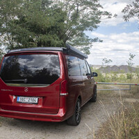 Trochu archaicky tady působí startování klíčkem, pak už naskočí naftový čtyřválec s dvoustupňovým přeplňováním a člověk musí uznale pokývat hlavou nad jeho kultivovaností. Nehlučí, nevibruje a při sešlápnutí pedálu umí auto rozpohybovat s nečekanou svižností. Takže zatímco s klasickým obytňákem musíte na dálnici buď trpět v pravém pruhu s kamiony, nebo s bolestí sledovat volný pád rafičky palivoměru, s Markem pojedete tak, jak jezdíte normálně. Když to bude hodně jako čuně, vezme si kolem deseti litrů nafty, dokáže si ale vystačit i s nějakými sedmi osmi. Ani nemluvím o točitých okreskách, kde jsou skříňové vehikly úplně za trest, protože zatáčejí jako… no jako skříňové vehikly. Véčko je známé jako obratná dodávka se skvělým podvozkem, což potvrzuje i tento konkrétní kus. Odpružení Airmatic taky dělá svoje. Kupodivu se na jízdních vlastnostech nijak zásadně nepodepisuje ani obytná vestavba. Ještě si vzpomínám na květnové cestování s plnotučným kamperem a zvuky, které se při zatáčení ozývaly ze zadní části vozu, mě straší ve snech dodneška. Pokud v Mercedesu něco drnčí nebo klepe, znamená to, že jste něco v poličkách nebo lednici blbě uložili, a za to auto nemůže. Takže i když máte s sebou postel, pracovnu i jídelnu, můžete jezdit jako s běžným autem. Vejdete se do každé uličky, na každé parkoviště, dokonce i do většiny podzemních garáží. A to je fakt paráda.
