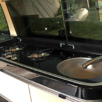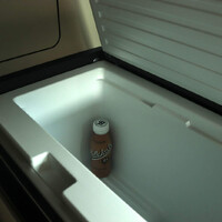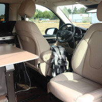 Vnitřní prostor je fakt dobře vymyšlený. Přední sedačky se otočí o stoosmdesát stupňů, čímž vznikne sezení kolem stolku. Pod oknem v řadě najdeme dost velkou ledničku, sporák a dřez, dole pod nimi šuplíky a skříňky s posuvnými dvířky. Všechny úložné prostory jsou docela dobře dostupné, stačí jen občas posunout se stolkem či sedačkami. Jediné, co mě trochu zarazilo, je jedna jediná nalezená zásuvka na 230. Když už se člověk v kempu připojí na elektřinu a potřebuje si dobít všechny přístroje, hodilo by se jich víc. Druhou výtku mám ke krémovému tapecírunku nad sporákem – nechci si představovat, jak bude vypadat za pár let. Naopak super je výklopná střecha, která s sebou nahoru umí vzít i matraci, takže se pak dole pohodlně postavíte. Manipulaci s ní navíc zvládne i holka.
