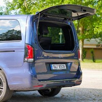 Z boku se toho na automobilu vlastně moc nemění. Ono totiž moc není co a jedinou zajímavostí tak mohou být 19palcová kola od AMG (pneu 245/45), která jsou v sadě AMG Line (+111 tisíc Kč) a v exteriéru je ještě doplňují výrazněji tvarované oba nárazníky. Na zádi dělají největší parádu především nová koncová světla, která tvoří celek vizuálně modernější. Změnou pro znalce je pak zúžení chromované lišty a přidání názvu výrobce. To praktické, jako nízká nakládací hrana, elektrické tažné zařízení nebo samostatně otevíratelné sklo pátých dveří, ale naštěstí zůstává. Na celku pak ještě zaujme zajímavá tmavě modrá barva (sodalitová) a posuvné dveře na obou stranách vozu.