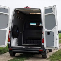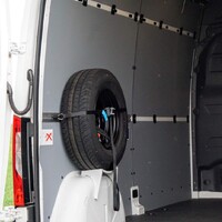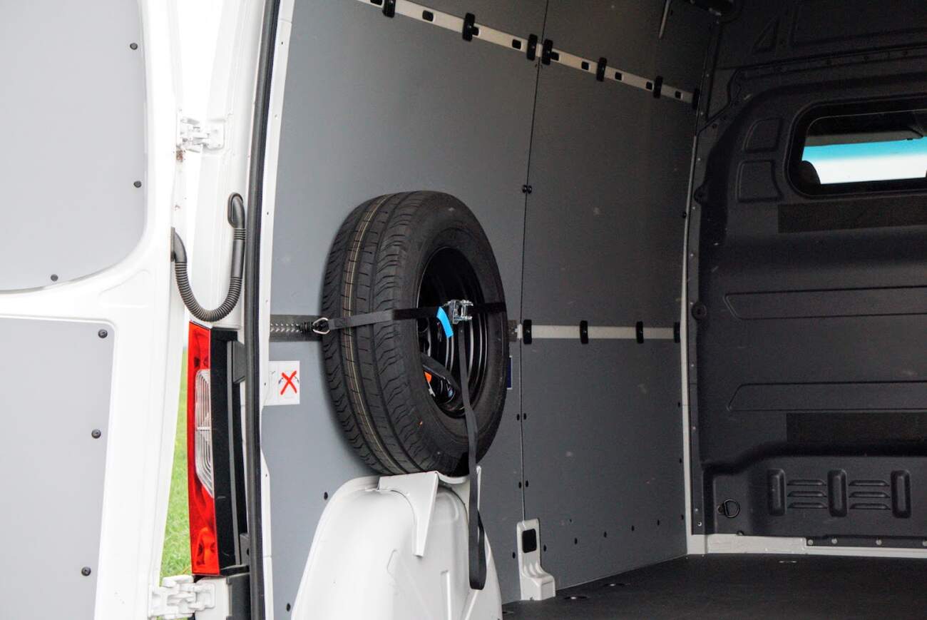 Ani nákladní prostor se od běžného Sprintera příliš neliší. Jediné, co je tu jinak, je umístění rezervy. Ta standardně visí zespod vozu pod zadními vraty, tady ale její místo zabírají baterie a tak se musela přestěhovat dovnitř. Jejímu bezpečnému připoutání posloužil kus lišty příplatkového systému na kotvení nákladu doplněný o stahovací popruh – obojí najdete v katalogu originálního příslušenství – jediná “na míru” dodělávaná součástka je tak takový ten plechový kousek, o který je samotná rezerva opřená. Dobrou zprávou ale je, objem 11 metrů krychlových, který střední vysoký Sprinter nabízí, není bateriemi nijak ukousnutý a rezervní kolo je jediná obstrukce plynoucí z elektrifikace.