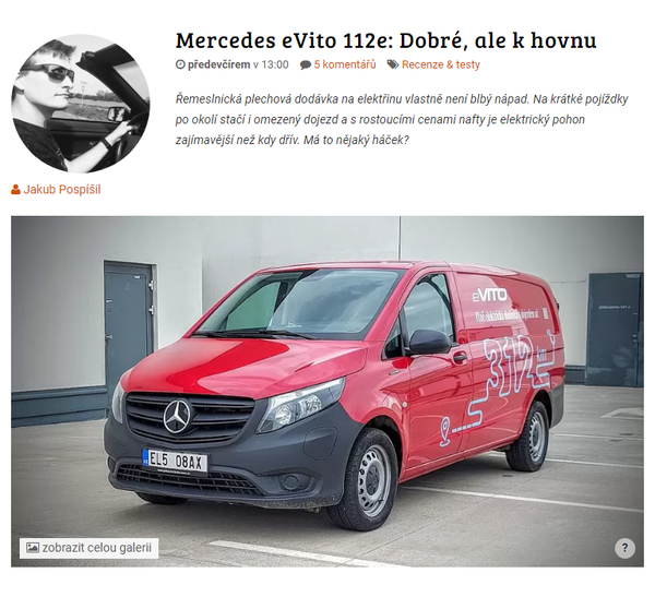 Mercedes eVito v obyčejné užitkové verzi dokazuje, že v Mercedesu bez ohledu na pohon pracovní auta zkrátka umí. Jezdilo se mi s ním dobře, elektrický drivetrain je slušně odladěný, stejně jako příjemný podvozek a utilitární, ale promyšlený interiér. Drobné chybky jako absence parkovacího senzoru nebo nevypínatelný airbag lze řešit příplatky za jednotky tisíc, jinak mi tu ale nic nechybělo. Největším konkurentem a nepřemožitelnou Nemesis tohoto sympatického vozu je jednoznačně jeho naftová verze, která dělá většinu věcí stejně dobře a stojí polovic. A cena je v kategorii vozů s nelakovanými nárazníky a halogenovými světly bohužel pořád jeden z nejdůležitějších argumentů. Bez berliček ve formě dotací tak, obávám se, zůstane bateriové eVito na našich silnicích jen povedenou kuriozitou.