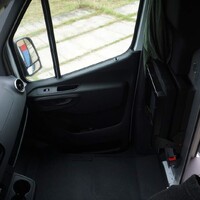 Kromě toho je tu ještě dvojice neobvyklých tlačítek na středovém panelu. To vpravo otevírá zadní “autobusové” dveře, tím levým se pak ovládá automatický režim, další naprosto zásadní trumf Sprinteru. S tímto módem totiž doručovací procedura, respektive veškeré otevírání dveří, rozsvěcení a podobně, probíhá zcela automaticky. Po zastavení vozu a vypnutí zapalování se odjistí dveře do nákladového prostoru (za jízdy jsou z bezpečnostních důvodů zamčené, lze je ale manuálně odjistit). Když je kurýr odsune, automaticky se rozsvítí zadní LED lustry a zároveň se otevřou boční “autobusová” dvířka. Řidič za sebou zavře dveře do kabiny a ta se celá zamkne, aby jeho osobní věci zůstaly v bezpečí. Po nalezení balíčku pak může vyjít ven z dodávky, boční dveře se automaticky zavřou a zamkne se i zadní trakt.