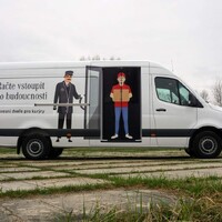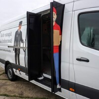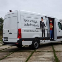 "Tohle auto vypadá ze tří stran jako klasický dlouhý Sprinter. Rozdílný je jen levý bok, kde (kromě reklamního polepu) najdeme dvoukřídlé dveře, ne nepodobné těm z městského autobusu."