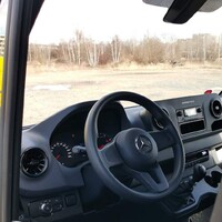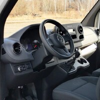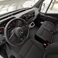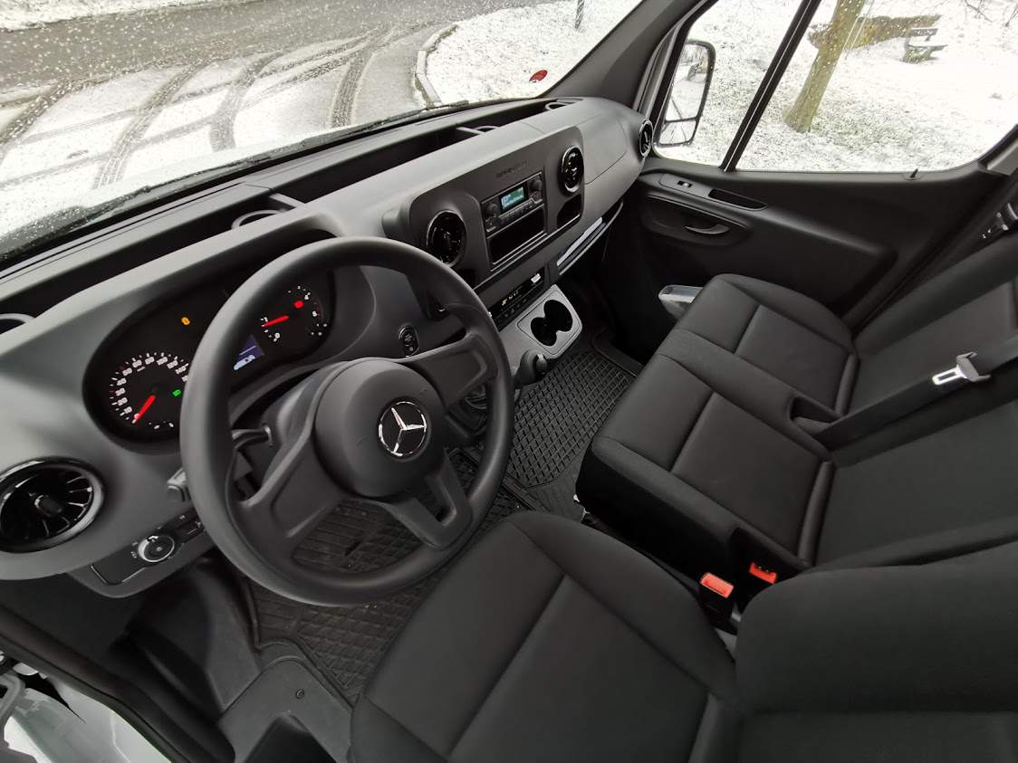 Sedačky čalouněné robustní látkou připomínají tvarem kancelářskou židli a opět překvapují nízkým rozsahem nastavení. Lavice spolujezdců je úplně napevno, řidič se může šoupat dopředu a dozadu a nastavit si sklon opěradla. Víc tu ale opravdu není potřeba – poloha za volantem je přirozená a příjemná. Z ergonomického hlediska si tak zaslouží Sprinter jen dvě malé výtky. Tu první za ovládání stěračů páčkou blinkrů, na které je zkrátka potřeba si zvyknout a tu druhou za ovládání palubního počítače malými “tyčinkami” čnějícími z přístrojové desky – ty se za jízdy mačkají opravdu špatně a přes volant na ně není vidět.