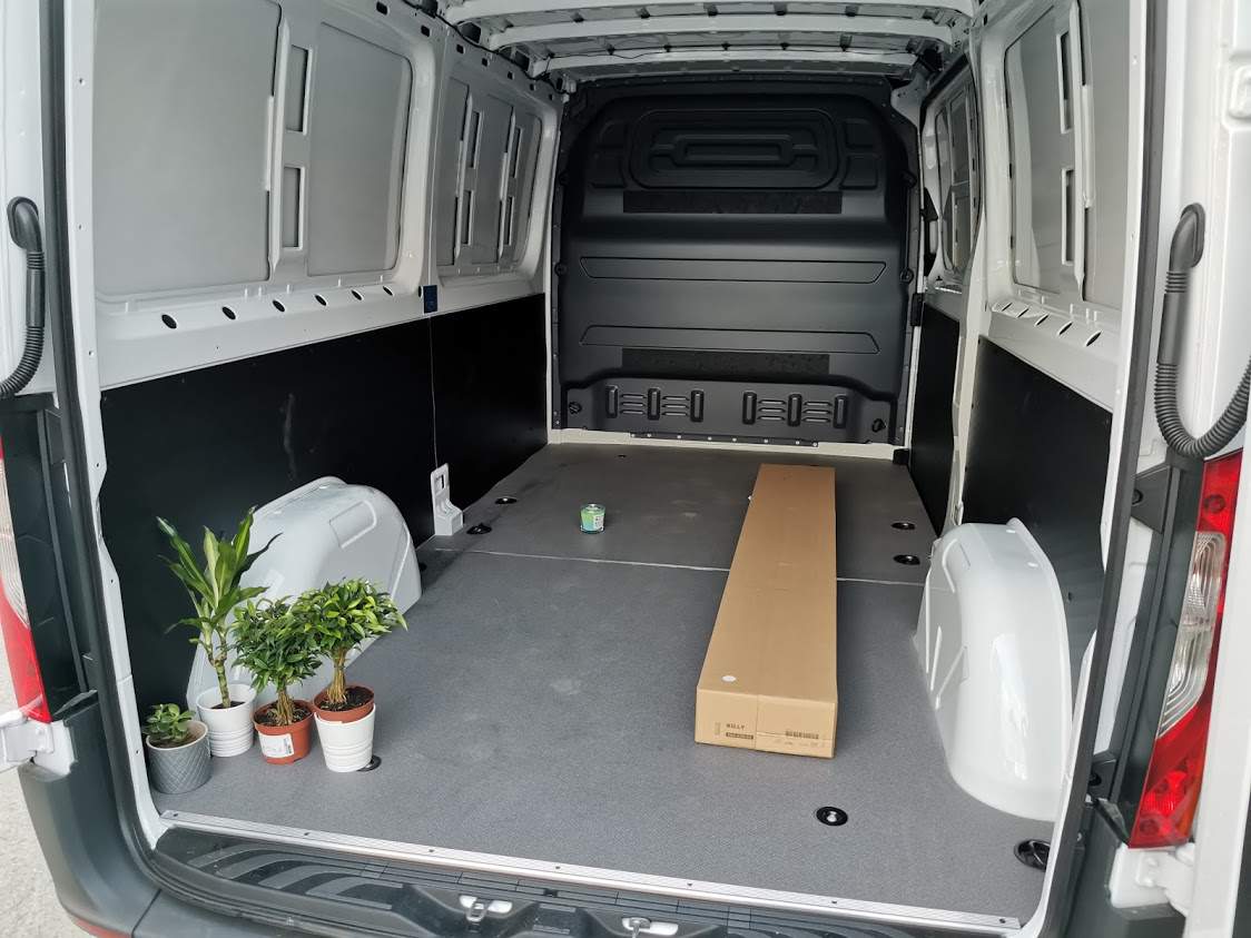 Účelná jednoduchost pokračuje i v zadním nákladovém prostoru. Je tu pevná podlaha s poměrně kluzkým povrchem (který potěší při manipulaci s věcmi “šoupáním”, ale vyžaduje důkladné upevnění všeho přepravovaného), plastové obložení spodní poloviny stěn a dvě jednoduchá světla nade dveřmi. Víc není třeba. Dovnitř se vejde devět a půl krychlového metru nákladu o maximální váze 945 kilogramů. Takže když mi náš redakční fotograf Radek zavolal, že potřebuje pomoct převézt z jednoho nejmenovaného nábytkového obchodu svojí novou velikou skříň (“Je fakt velká, to by se do kombíku nevešlo.”), ubezpečil jsem ho, že to nebude problém. A nebyl. On by to asi nebyl problém ani v kombíku, ale když už byla k dispozici ta dodávka… Pocit z prázdnoty prostoru jsme se snažili kompenzovat zakoupením pokojových rostlin a vonné svíčky, nicméně výsledný dojem to příliš nevylepšilo – posuďte sami.