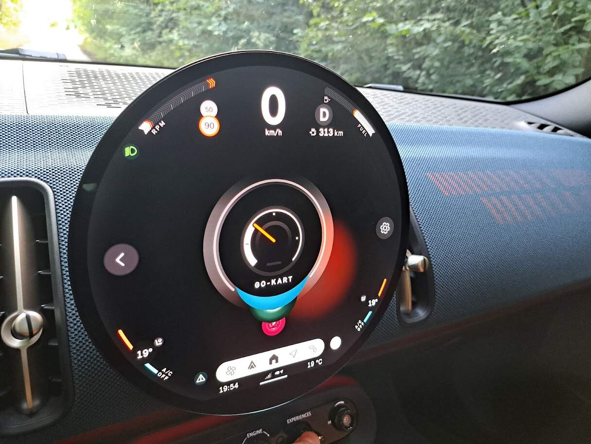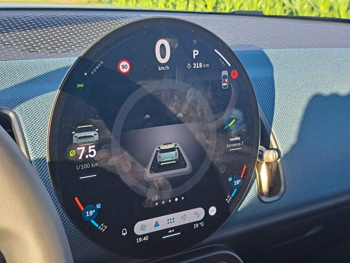 A to tu je spousta věcí, které potenciálně mohly dopadnout dost mizerně. Mini se navzdory trendům musí obejít jen s jedním centrálním displejem (což má potenciál dopadnout fakt špatně, vzpomeňme na Teslu Model 3, i když tady je alespoň ještě HUD), tady navíc ještě kulatým. Jenže ono to funguje. Členění displeje je přehledné a jednoduché a ačkoli umí stpoustu věcí, většinu z nich za jízdy zobrazí na centrální “domovské” obrazovce. Dokonce i to nešťastné dotykové ovládání klimatizace tu funguje celkem intuitivně a jednoduše.