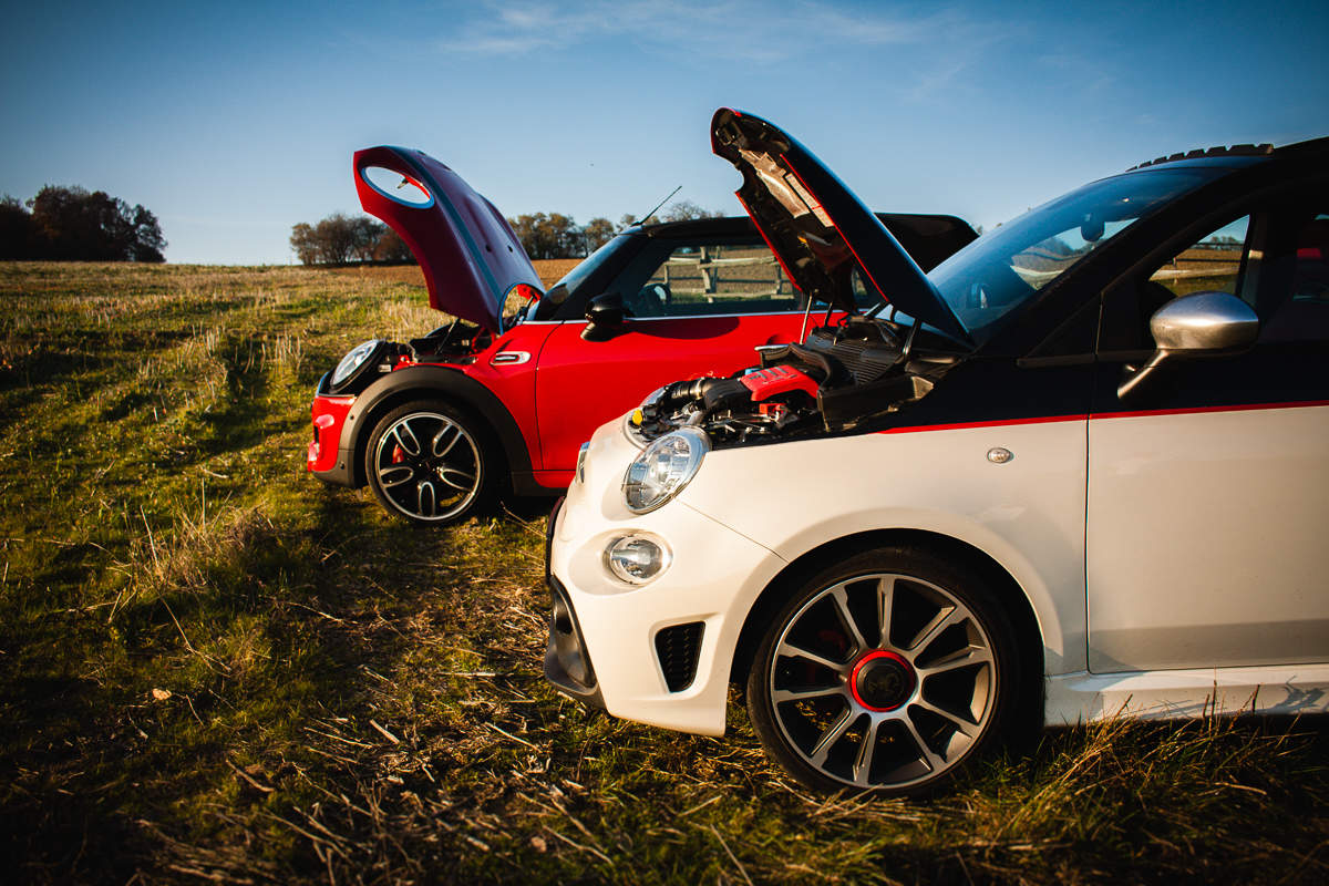 Není to Fiat, je to Abarth! No dobrá, sedačku bych si dal o trochu níž, kdyby to šlo, ale zas tak hrozné to není. A narozdíl od Zlokočky, já mám v autě i kufr. Ale nechme toho, pojďme radši jezdit. Abarth pohání skvělý motor 1.4 T-Jet, ve specifikaci Turismo laděný na 165 koní. Testovaný kus výkon na kola přenáší přes pětistupňovou robotizovanou převodovku s jednou spojkou. Je potřeba se s robotem sladit na společnou vlnu, na zakroucené silnici a v plném tempu je však poté řazení radost. A nejen řazení. Lehoučké autíčko s koly v rozích karoserie je až nečekaně schopné a bezprostřední. Systém TTC nahrazující ovládáním brzd samosvorný diferenciál spolu s nízkou hmotností je patrně odpovědný za většinu toho kouzla. Abarth odmítá být nedotáčivý, záď se nebrání hravému vybočení. Mini se v přímém srovnání s Abarthem chová jako mnohem těžší a dospělejší auto. Především u brzd je cítit, že mají s autem mnohem více práce. Jistě na tom má svůj podíl viny i zvolená verze kabrio, která s sebou vozí nezanedbatelné množství nutných výztuh.