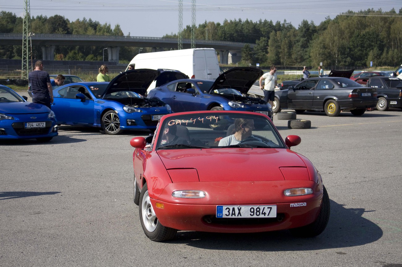 Zbytek zimy jsem strávil občasným až častým ježděním. Párkrát jsem se dokonce zapomněl na zasněženém parkovišti u jisté nadnárodní společnosti a při průchodu recepcí mě provázely spiklenecké úsměvy ostrahy. Uteklo to jako voda. A pak přišel začátek okruhové sezóny v Sosnové. Sliboval jsem si, že vážně nebudu moc jezdit, protože místní asfalt je vážně hrubý a nechci hned kupovat nové pneumatiky. No, ale.. Nastěstí mi byl zapůjčen jeden pár pneumatik ke zničení a tak to odnesl jen jeden pár. Byl to zároveň můj první trackday s MX-5 a nakonec jsem byl příjemně překvapený, že možná nejsem úplně levej a že je to mnohem větší zábava, než jsem čekal. A pak další spousta ježdění do školy a práce, projížďky s homosmečkou, prostě veselý život kadeřníka. S přibývajícím časem mě jen začal víc štvát zvuk, který vydávala převodovka. Jasně, pištící zvuk, jako by měla přímý ozub, je cool, ale ne pokud jedete někam dál. Navíc se z pohonného ústrojí začalo ozývat nějaké další skřípání a nepěkné zvuky. Prozatím jsem si to dal na seznam věcí k vyřešení a vyrazil na trackday do Písku. Tam se ale poprvé projevil další problém. Chlazení. Nebylo možné ujet více než tři kola, než se ručička začala dostávat nepěkně vysoko. Rozhodl jsem se tedy pořádně propláchnout chladící systém. A také jsem se dostal k výměně promáčklého blatníku, abych se s Mazdou mohl zúčastnit velké slávy v Bratislavském showroomu, kde jsem se potkal s ND. Ale po cestě zpátky se problém s přehříváním vrátil. No nic, nedalo se nic dělat, bylo třeba začít to řešit.