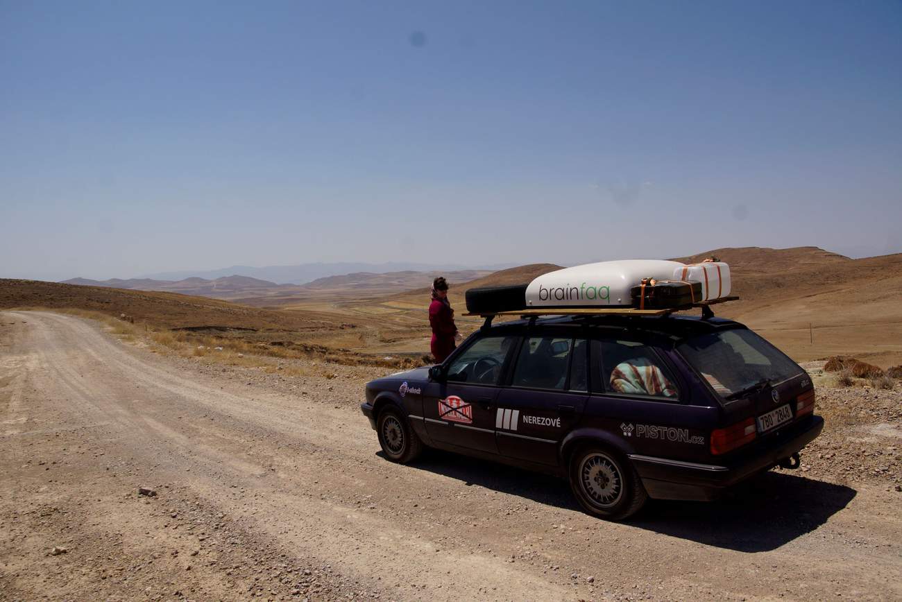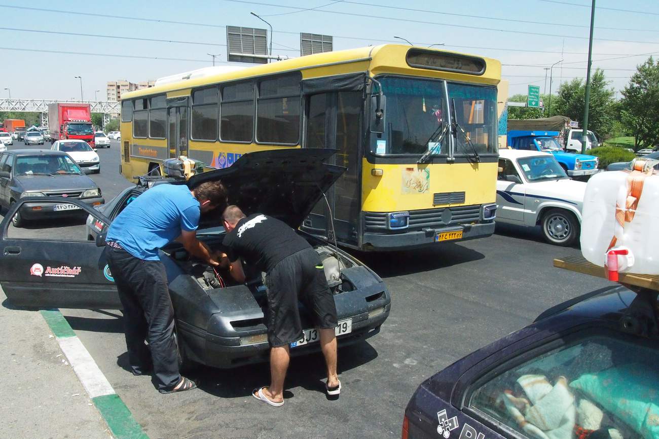 Odpočatí pokračujeme na východ, kolem Teheránu. V Sergejovi něco klepe, jako když trpaslík bouchá gumovým kladívkem o plech. Trvá nám tři zastávky, než najdeme správného trpaslíka u krytu podběhu a přivážeme mu ručičku stahovací páskou. (Vojta by to sice napsal jinak, ale ten řídí a diktuje Markétě :P ) Teploty kolem poledne s přehledem přesahují 40°C. Holky se začínají přehřívat. Nejdřív Markéta, musí být navlečená v dlouhých kalhotech, košili s dlouhým rukávem a s šátkem na hlavě. Větrání je tak značně neefektivní. Pak se začne přehřívat i Jitka. Ta nemusí oblékat všechny ty islámské vrstvy, takže příčina bude určitě jinde. Chladič nemá dostatečný přívod vzduchu. Kluci musí proto často zapínat elektrické vrtule a to nesvědčí jejich relátkům a pojistkám, které mají tendenci hořet a tavit se. Nemáme lepší řešení než je v pravidelných intervalech měnit.