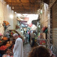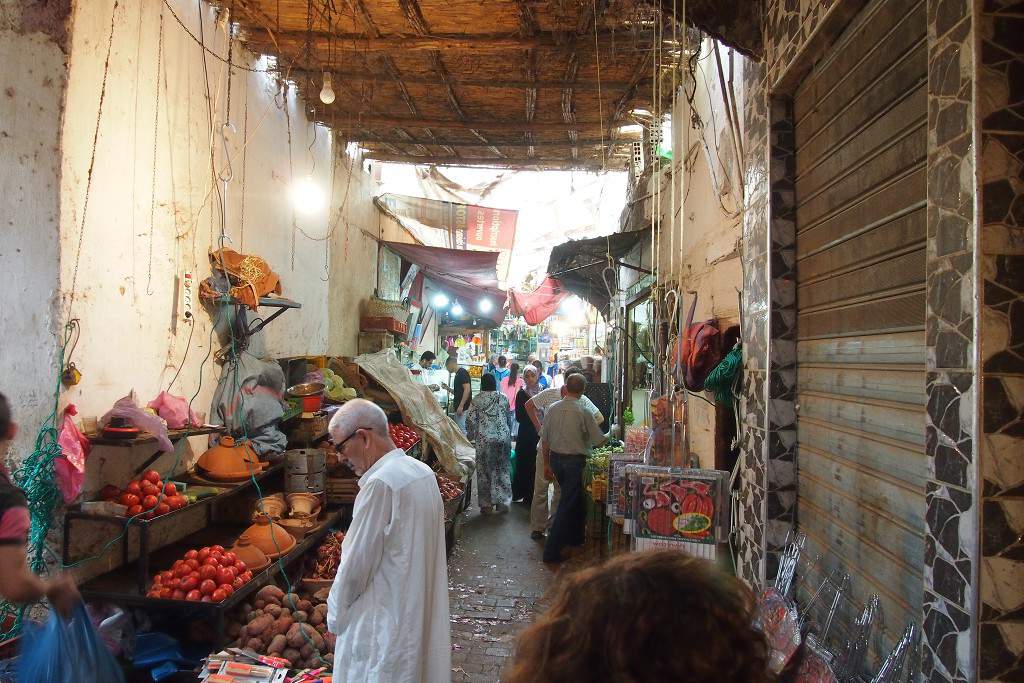 Provoz ve Fésu je docela masakr, taxikář to pěkně sype, pruhů na cestě je tolik kolik se vleze aut vedle sebe, jezdí se tu na centimetry a agresivně. Je v tom všem chaosu ale cítit i jakýsi nádech pohody, taxikář se za jízdy směje, že se někdo jiný nevlezl nebo musel brzdit, v úplně ucpaném kruháči drží klakson klidně minutu v kuse a u toho se pořád směje, prostě normální den v práci, pohoda. Přijíždíme na okraj mediny a teprve mi dochází, co to vlastně medina je. Je to obrovské bludiště uliček v kterém žije zhruba 150 tisíc lidí. Odchytává si nás tady místní samozvaný průvodce, ale nám to nakonec vůbec nevadí, protože víme, že bez průvodce to tady nezvládnem. Na okraji mediny uličky začínají jako tržiště, jsou tady vedle sebe náhodně rozeseté „obchůdky“. Kromě těch ještě docela pěkných se zeleninou a ovocem jsou zde i obchody s masem, kde na dřevěných stolech leží kusy masa a vedle toho třeba useknuté kopyta nebo uřezané kozí hlavy. Hned vedle je klidně „obchůdek“ s uhlím – hromada uhlí, na které sedí člověk a lopatkou se v něm přehrabuje a nasypává zákazníkům uhlí do jejich košů.. O kus dál tržiště mizí a vcházíme do samotných uliček – některé uličky jsou úplně obyčejné, některé jsou velmi naturalistické, děti tu běžně hrajou fotbal, jsou tady kozí a ovčí hovna na zemi, po zemi teče kalná voda a je tu všeobecný smrad a špína. Občas vidíme do pootevřených dveří, někdy je za dveřmi normální byt, někdy stolařská dílna, někdy vstup do mešity. Z venku to nelze na první pohled rozeznat.