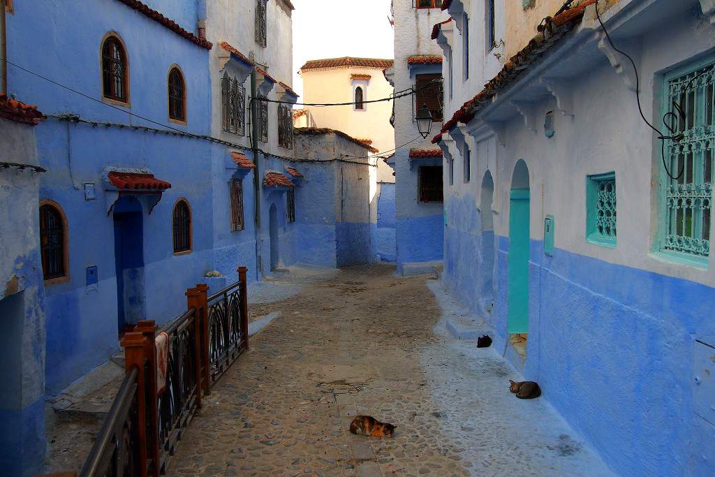 Cesta ubíhá docela rychle, asfalt je vcelku bezproblémový a krajina nám ze všeho nejvíc připomíná Albánii. Stále jsme relativně nedaleko moře a tak je krajina pořád dost zelená. V pozdní odpoledne přijíždíme do Chefchauenu, zažíváme první město se správnou marockou dopravou, skrz chaos a všeobecný ruch projíždíme až k historické části města s úzkými uličkami. Po chvíli nás místní nasměřují na uličku, kde se dá bez problému parkovat. Bereme věci a jdeme se ubytovat. Náš hostel je v jedné z uliček, musí nás k němu dovést místní, sami bychom ho hledali těžko.