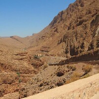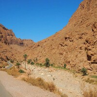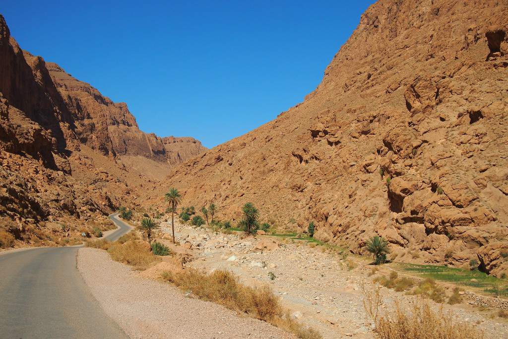 V centru města panuje klid a horko, téměř nikdo není venku. Došly nám Dirhamy a nemáme kde zaměnit. Nedá se nic dělat, pokračujeme v cestě do soutěsky. Cesta je pohodový asfalt a z Tinghiru to není daleko. Nejužší místo soutěsky je hned na jejím začátku, v říčce uprostřed soutěsky teče studená voda, na šířku to tady má možná 15m, na výšku mají skály prý až 200m. V nejužším místě si zchladíme nohy a pokračujeme hlouběji do soutěsky. Ta se lehce otevírá, v jejím středu se táhne malinká oáza, po stranách se tyčí skály. Ve skalách vidíme chodit kozy a pak si všimneme, že o mnoho metrů nad nimi jsou jejich pastevci, kteří ve výškách kam se kozy už nedostanou, kácejí veškerý (byť velmi chabý) porost a shazují jej dolů kozám.