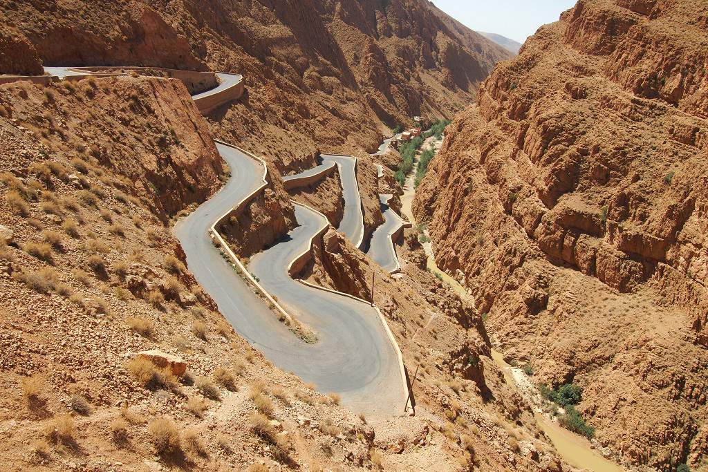Projíždíme soutěskou, dokud nás to baví, víme, že se budeme zase vracet zpátky, protože přes Atlas přejíždět ještě nechceme a navíc by to touto cestou šlo relativně obtížně. Když se asfalt příliš zhorší, tak to otáčíme a jedeme zpět. O zhruba 50 km směrem na Ouarzazate je další soutěska – Dádes. Cestou skrz soutěsku projíždíme okolo spousty zvláštních skalních útvarů, jakoby láva vytryskla do vzduchu a zatuhla, nadšenci geologie by si zde přišli na své :) Soutěska Dádes je také známá pro svůj asi 1 km dlouhý úsek plný zatáček. Věděl jsem že to tady je a tak jsem si to musel projet.