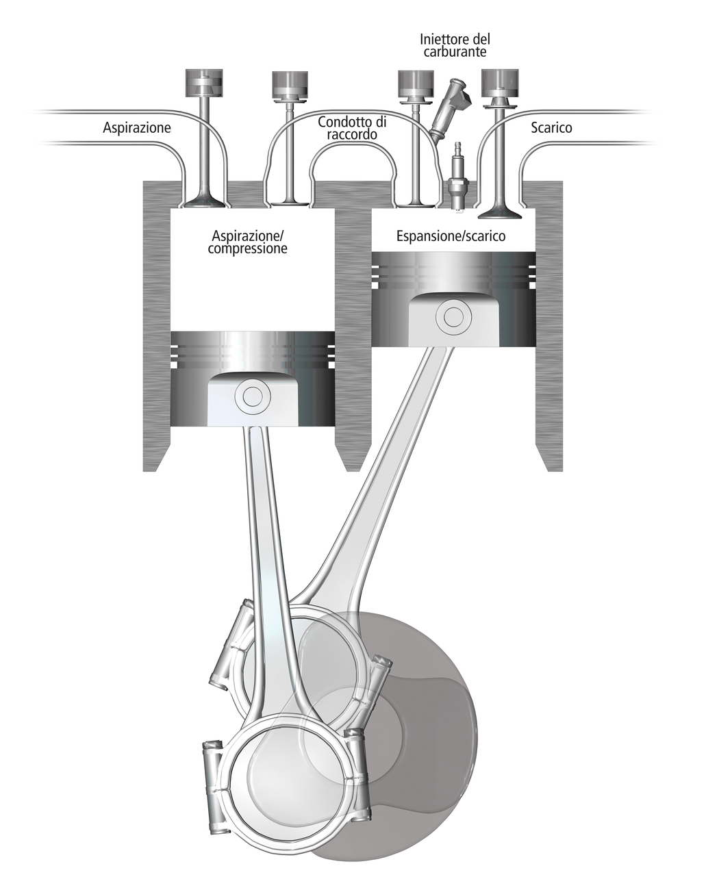 Stejně jako u předchozího odstavce, ani v tomto případě nejde o úplnou novinku. Myšlenka motoru s rozdělnými cykly je známá již od samého počátku dvacátého století. Počítá s rozdělením čtyřdobého motoru mezi dva válce. První slouží k sání a ke kompresi, zatímco druhý spaluje palivo a vypouští odpadní plyny. Zajímavým doplňkem je možnost regeneračního brzdění, při kterém kompresní válec generuje stlačený vzduch do zásobníku k pozdějšímu využití pro spalování. Celá myšlenka je v základu dobrá, jelikož čtyřdobý motor tak může pracovat ne čtvrtinu, ale celou polovinu doby trvání cyklu. Navíc stlačený vzduch vycházející z prvního válce do druhého je možné ještě dochladit a pomoci tak s emisemi. Společnost Scuderi Group se pyšní výkonem 135 koní na litr objemu, vyšší účinností i nižšími emisemi. V souvislosti s touto technologií vlastní firma mnoho patentů a podepsala také smlouvy o spolupráci s předními automobilovými výrobci. Bohužel se nedávno ukázalo, že celá slibná technologie je pouze věrohodným nápadem zakrývajícím klasické Ponziho pyramidové schéma vykutálených vlastníků. Ačkoliv prvotní simulace nového motoru vypadaly slibně, původní vlastníci se k firmě nyní nehlásí a ta čelí několika žalobám ze strany investorů, mezi kterými je i jedna z poboček Toyoty.