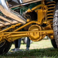 To už mě ale dostihl zbytek výpravy a začali jsme opět korzovat. Měl jsem chvíli tendence celou plochu procházet systematicky, ale to padlo hned, jakmile jsem uviděl Esprit s původním hranatým nárazníkem, pak kachnu a v pozadí Jeep se zlatým podvozkem. Podvozek zlatý včetně gumových prvků na zavěšení, na zádi značka z Arizony a v interiéru tachometr v kilometrech. Moc nevím, proč byl tenhle bastl na ploše, snad jen kvůli koloritu? Nebo aby mohli nerdi jako já nad něčím brblat?