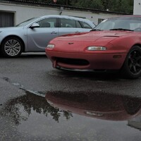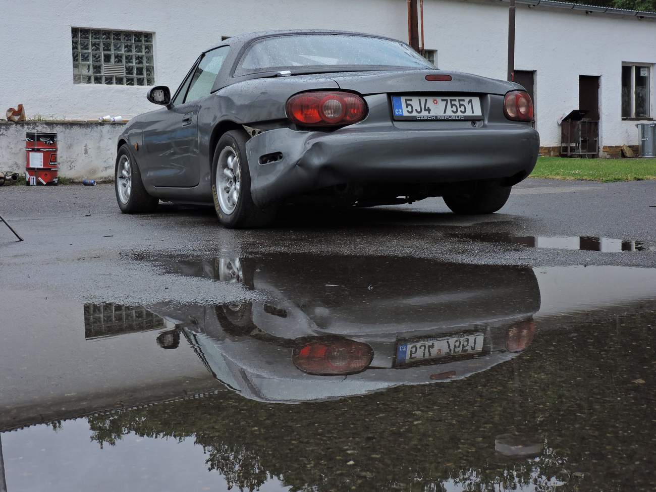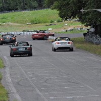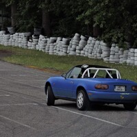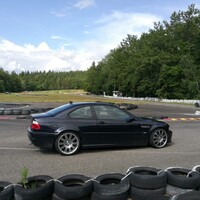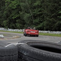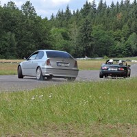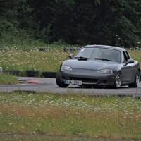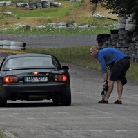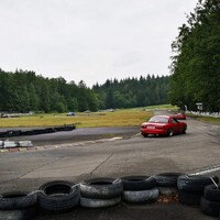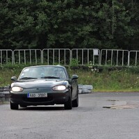 Předpověď byla celkem jednoznačná, takže jsem nechal na Mazdě sadu silničních disků s novými Uniroyal Rainsport 3 a nenamáhal se zjišťovat, jak a zda vůbec lze v NC převézt čtyři kusy 7,5x17 kol s obutými semislicky od Federalu. Ráno nás na okruhu přivítala zamračená omloha a trať mokrá z nočního deště. Světlá místa na nebi však příliš nekorespondovala s výhledem na další přeháňky. První seznamovací jízdy se nesly ve veselém uklouzaném duchu. Mazdy stěží hledaly trakci a po trati krásně vlály. Další déšť ale nepřicházel a trať postupně začínala osychat. V boxech na parkovišti před vjezdem na okruh probíhala u některých lépe připravených účastníků horečná dilemata, zda přezout na slicky či semislicky nebo zůstat na prořezanějších pneumatikách.