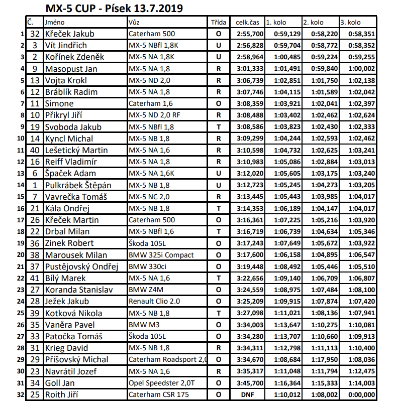 Zvláštní zmínku si zaslouží Nikola Kotková, která jezdila v krásném červeném NB. Na okruhu byla vůbec poprvé a výsledek nakonec nebyl vůbec špatný. Čtvrtý závod je v plánu za necelý měsíc – 17. srpna ve Vysokém Mýtě. A já budu doufat, že napotřetí se mi letos konečně povede být spokojen.