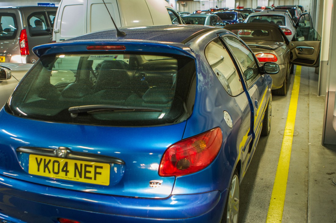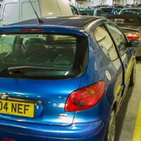 Peugeot 206 GTi 180, 10 minut od letiště Stansted. Najeto 95 tisíc mil, vyndaný katalyzátor, větší vstřiky, přeprogramovaná řídící jednotka. Deklarovaný výkon 195 koní. Trochu mi u počtu koní vadilo slovo „domnívám se“, zvlášť když vím, jak těžké je z atmosférického motoru dostat koně navíc, ale mechanické změny naznačovaly, že by tam skutečně nějaká změna k většímu výkonu být mohla.