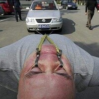 Tohle je fakt nechutné, a tak sem obrázek raději ani dávat nebudu. Ti odvážní si jej pomou rozkliknout zde, ale moc to nedoporučuji. Už jen představa protažení čehokoli přes nos do úst mi přijde dost za hranou, ale možná jsem jen moc citlivka. Kanadský televizní kaskadér Ryan Stock totiž podobné kousky dělá běžně. Nakonec tímto způsobem dokázal pohnout autem o hmotnosti 983 kg. Celkem ale Ryan drží pět světových rekordů, třeba včetně nejtěžšího vozidla taženého spolknutým mečem.
