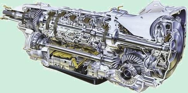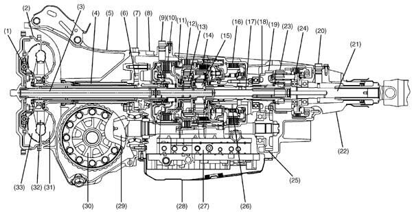 - dále na kleci čelní ozubený kolo pro pohon přední nápravy - proti němu je pak stejně velký (převod 1:1) a od něj hřídel skrz celou převodovku až dopředu, kde je v podstatě těsně za měničem momentu přední nápravovej diferák