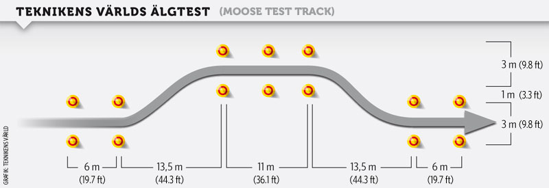 Jak vypadá testovací dráha a rozestavění kuželů? Je nezbytné, aby rozmístění kuželů zůstalo vždy stejné, tak aby byla zachována porovnatelnost výsledků. Pokud se zaměříme na vzdálenosti, při kterých auto musí samotný manévr zvládnout – je to obdelník o stranách 13,5 x 3 metry, a to není při 70 Km/h zrovna mnoho.