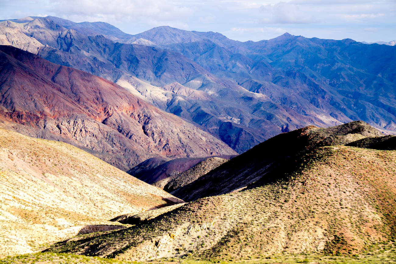 Trošku realističtější barvy tedy na téhle fotce. Co je fantastické na Nevadě a přilehlé Koulifornii je nehotovost zdejší části zeměkoule. V podstatě tu není rovina, i když se vám to nekonečné plochy ostrého štěrku snaží namluvit. Jezdíte prostě po místech, kde z úplně fungl nových skal padaj kamínky, ty se pak shlukují v údolích a pomalu, ale jistě zasypávaj nejnižší body… Velmi barevným štěrkem. Je to tu nehotové, nové a někdy až jakoby z jiné planety. Mimochodem, všimli jste si, že tuhle krajinu miluju? Fotka níže ukazuje kterak se kamínky z hory sypou…