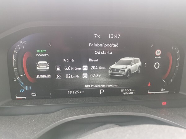 Ale teď k tomu turbo efektu z nadpisu. Jde o to, že pokud chcete najednou plný výkon (předjíždění, výjezdy z vedlejší, nepřehledné křižovatky podobně), tak samozřejmě sešlápnete pedál na podlahu. V tu chvíli vám okamžitě dá baterie do elektromotorů, co může, ale pocitově mi připadá, jako by dávala tak poloviční množství výkonu, než který si o motorech můžeme přečíst v technickém průkazu. Po půl vteřince naskakuje spalovací motor, pak se vytočí na odpovídající otáčky a po další půl vteřince jako by najednou začal výkon z motoru téct přes baterii přímo na kola a vůz pocitově napodruhé výrazně přidá. Pak už je těch 213 koní opravdu přítomných a v tu chvíli je X-Trail až nečekaně rychlý. Motor je už trochu slyšet, ale stále nic nepříjemného. Auto nabírá rychlost do cca 150 km/h velmi rychle a taky ji díky elektromotorům dobře maskuje. Takže si budete hezky plout krajinou půl metru nad ostatními řidiči a divit se, proč se najednou všichni před vámi taky rychle přibližují. Pocit při plné akceleraci je stejný jako při čekání na nafoukání turbodmychadla. Jako by malá baterie nebyla schopná elektromotory okamžitě krátkodobě krmit potřebným napětím a zvládne to až ve spojení s generátorem elektřiny od motoru.