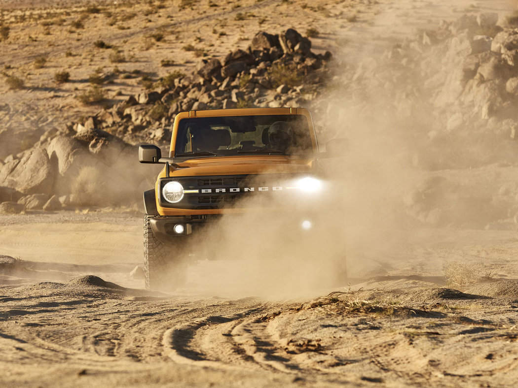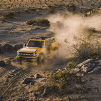 A co že vlastně bude tuhle působivou terénní kreaci pohánět? Zatím jsou k dispozici dva motory. 2,3 litrový přeplňovaný ecoboost (270 koní, 420 Nm), který je k dispozici se sedmistupňovým manuálem, nebo desetistupňovým hydroměničem, a 2,7 litrový vidlicový šestiválec, který lze prozatím objednat jen s automatem. Základní manuální čtyřválec ve třídveřovém Broncu startuje na ceně 29 995 dolarů (lehce přes 700 tisíc). A ty 35palcové terénní gumy, jak mají auta na fotkách, jsou už v ceně bez příplatku.