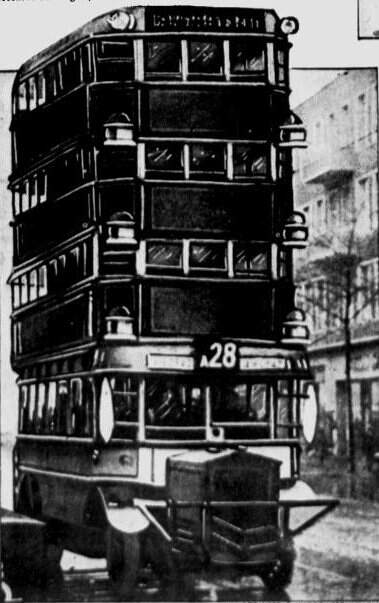 Pusťme se tedy do této problematiky pěkně chronologicky. Obrázek výše je pravděpodobně nejstarší realistické vyobrazení třípatrového autobusu. V hlubinách internetu naleznete spoustu erudovaně se tvářících článků, které přísahají, kterak tento autobus jezdil na trase mezi berlínským vlakovým nádražím a centrem města, jiné se drží zkrátka a udávají, že vůz fungoval pouze v testovacím provozu. Žel realita je ještě prostší – žádný takový autobus nikdy neexistoval. Fotografie je fotomontáž a vyšla v dubnu 1926 časopise Echo Continental (věstník do dnešních dnů dobře známého výrobce autodílů Continental AG) a který oznamoval spuštění testovacího provozu prvního třípatrového autobusu postaveného (jak jinak) inženýry z Continentalu. Šlo ale o aprílové číslo plné dalších “neuvěřitelných” zpráv, třípatrák v Berlíně je tak jen nevinný žertík, který dodnes čas od času splete nepozorného internetového badatele.