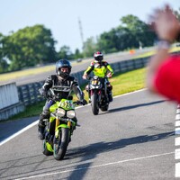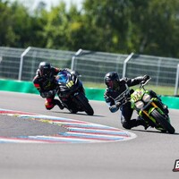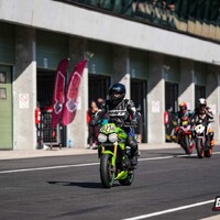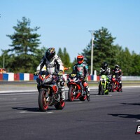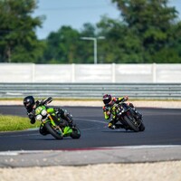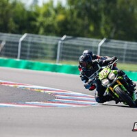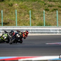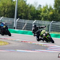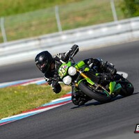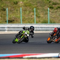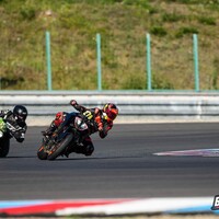 Start stojí tradičně za pendrek. Po úvodním odražení litrové Kawasaki se mi daří v táhlejší levé (T9), kde se odhodlávám a i s kolenem na zemi okolo 170 km/h topím plný plyn. Následuje klikatější technická část, kde uplatňuji pozdní brzdy za horizontem a zmiňovanou obratnost. Najednou dvěma Goliášům dýchám na záda. Následují dvě rovinky, spojené poslední zatáčkou, která mi zoufale nejde, takže nic. Ve třetím kole se mi dokonce na brzdách daří litrové Mko zdolat. Užívám si pár sekund slávy v následujících zatáčkách. Je mi jasné, že to není na dlouho. Hmm, tak první rovinka mi prošla, že by přece jen … aha, ne, tady je. Na cílovce si BMW bere svoje místo zpátky, můj tachometr sice ukazuje 200 km/h, ale u toho předjetí se zdá, jako bych jel na kole. V technické části se mi ho však opět daří poškádlit a situace se opakuje. Závod dokončuji za ním. Start z deváteho místa, finiš na desátém. Takhle to zní nic moc, ale adrenalin a zábava maximální. Brzdy fungují výborně a nové slicky s nahříváky jsou v podstatě podvod. Abych nezapoměl, taky se nic nerozbilo. Absolutní spokojenost. Vaškovi se pak daří doslova majstrštyk v závodě Open 1, kde do poslední chvíle bojuje o přední příčky.