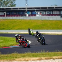 Start, slabota, řadím dvojku a v mžiku se kolem mě prožene šest motorek, jež se předvídatelně řadí do stopy. Následuje nálet na vnitřek dle plánu a beru čtyři místa zpátky. Heh, to asi fungovalo lépe než jsem čekal. Jenže nadšení brzy střídá napětí hned v druhé zatáčce. Letím za KTM Duke a brzdím samozřejmě dost pozdě, proti 1290 ccm motoru jinou zbraň nemám. KTM krouží venkem, já se řadím za M1000R (tuším, že stejný jezdec jako na Slováči). Jenže před ním byla nějaká nepřehledná tlačenice a najednou BMW prostě jede hrozně pomalu. Jenže už mi nepřijde, že je čas a místo k dalšímu náletu na vnitřek. Mám co dělat, abych ubrzdil. Dokonce následně ještě stíhám předjetí venkem. V nájezdu na Céčko vidím zvířený prach, kousek přede mnou to někdo zahodil. Uf, za tohle první kolo byl teda adrenalin na 11/10. V zatáčkách se držím, ale na pár místech mi KTM křižuje stopu a musím na okamžik ubrat plyn, což je pro můj malý motor konečná.