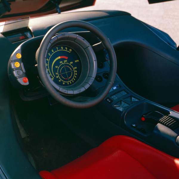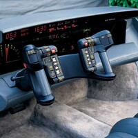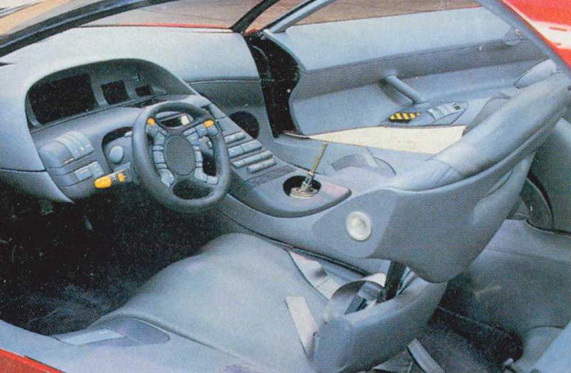 Třímístná kabina jako v McLarenu. Řidič sedí uprostřed, na volantu má telefonní číselník, tachometr je před spolujezdcem vpravo, otáčkoměr před tím vlevo, řidič sleduje skrz volant CRT obrazovku. Vpravo od volantu se vykukuje kompaktní ovládání topení, vlevo tempomat a to je celé. Ač to asi zní dost divně, napadá mě slovní spojení “přeplácaný minimalismus”. A aby těch výstřelků nebylo málo, celé auto navíc připomíná pyramidu.