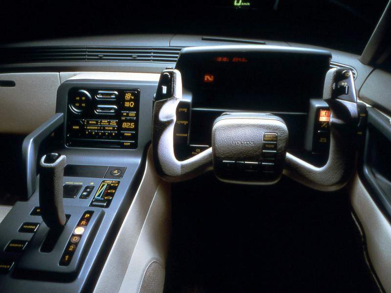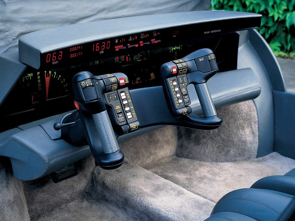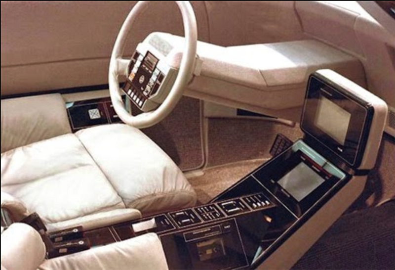 Další Buick, tentokrát pojatý přeci jen trochu konvenčněji. Za povšimnutí stojí kazetový přehravač orientovaný směrem ke spolujezdci (ergonomie občas trošičku pokulhávala), masivní sloupek řízení a “klaviatura” tlačítek na spodní hraně volantu. Na rozdíl od ostentativně futuristických konceptů výše hraje Questor spíše na luxusní notu. Středová konzole s dvojicí (tehdy ještě nedotykových) displejů ale nápadně připomíná některé dnešní vozy.