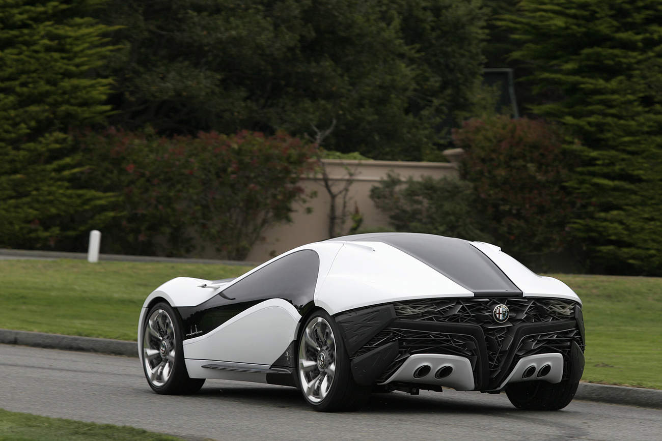 Podstatné jsou tvary. Mezi uhlazenými sněhově bílými fragmenty karoserie je vidno zběsilé tvary šelmy uvnitř. Přední světla číhají v temné škvíře v přídi vozu jak oči šelmy, zadní světla žhnou ze změti zdánlivě nikde neukotvených tvarů. Celé to působí velmi organicky a dynamicky. Tento dojem ještě umocňuje boční prosklení táhnoucí se od blatníku k blatníku. Všechno nejlepší Alfo!