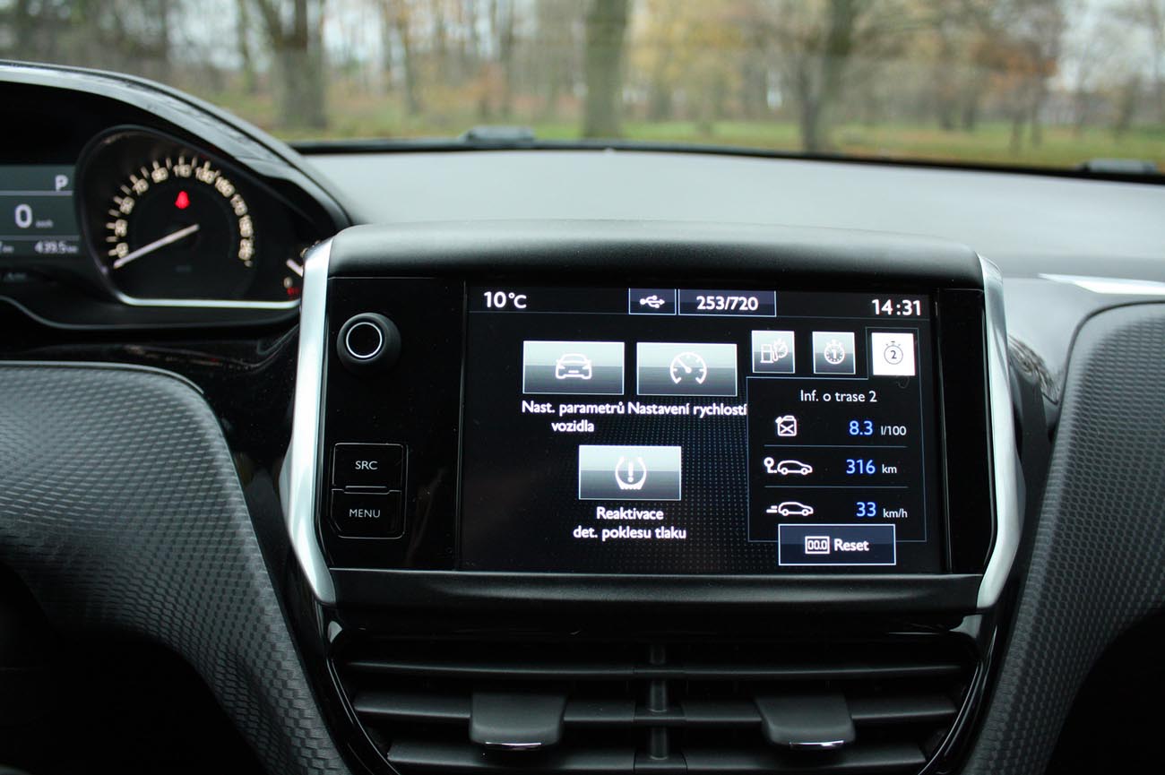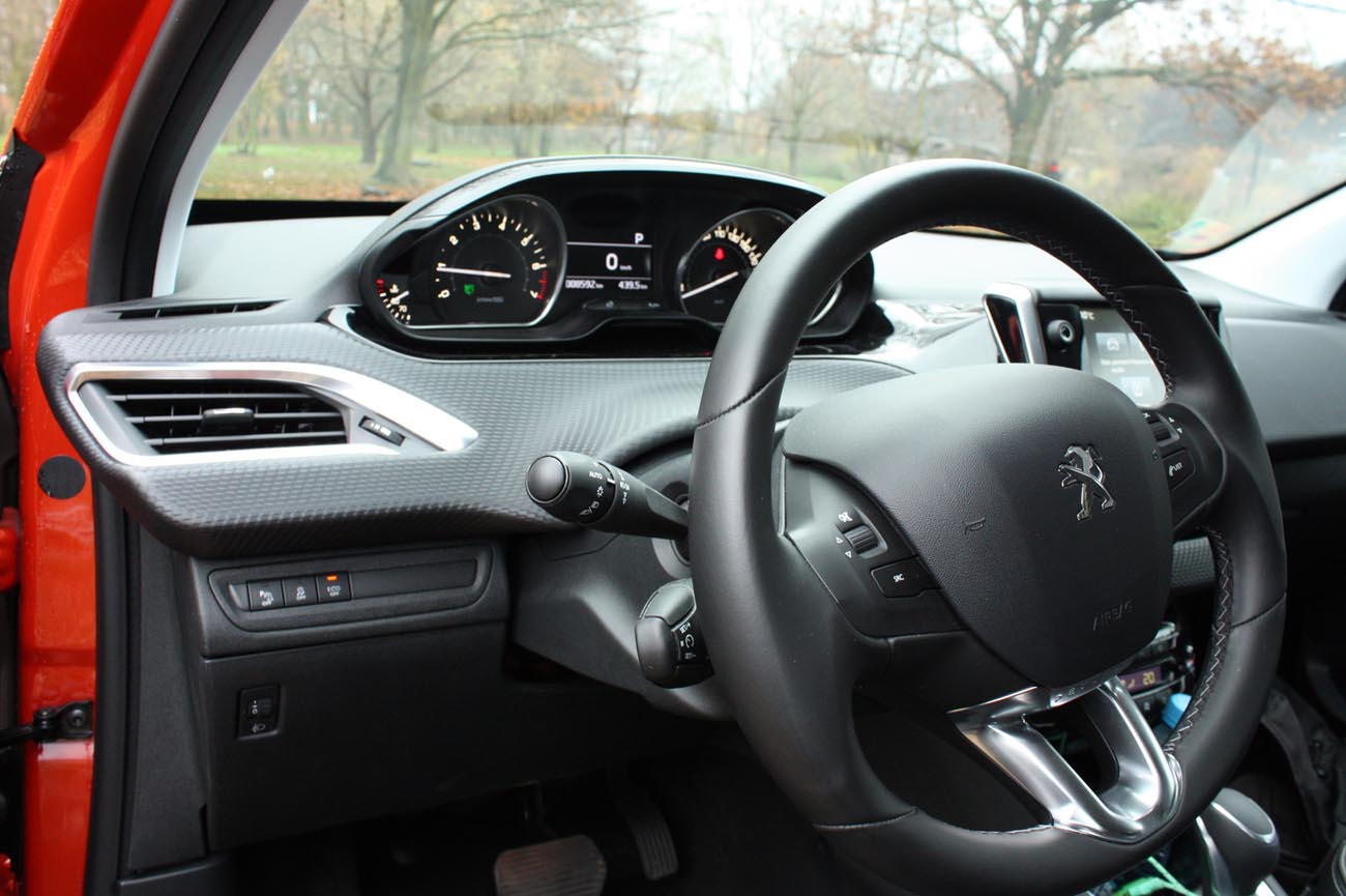 Je to několikátý nový Peugeot, s nímž mám tu čest, a pořád jsem si na architekturu palubní desky nezvykl. 208 nabízí v podstatě jen dvě možnosti, jak se s tím popasovat. Buď budete mít volant ve vyšší poloze a tím pádem neuvidíte na budíky, anebo ho nastavíte do nižší polohy a budete řídit koleny. Já si vybral tu druhou variantu a právě nízko umístěný volant mi pil krev asi ze všeho nejvíc. Při každém nástupu či výstupu z auta, jsem se o něj zachytil kolenem. Pamatujte na to, až si jednou půjdete pro 208 do bazaru – odřený volant nemusí nutně znamenat vysoký kilometrový nájezd. Předpokládám, že bude dodrbaný velmi rychle, a stejně tak vaše džíny. S pozicí za volantem souvisí i poloha sedaček. Jsou zbytečně vysoko, celou dobu jsem měl pocit, jako bych seděl na barové stoličce. Což je, vzhledem k faktu, že samotné sedačky jsou skvělé, vážně škoda.