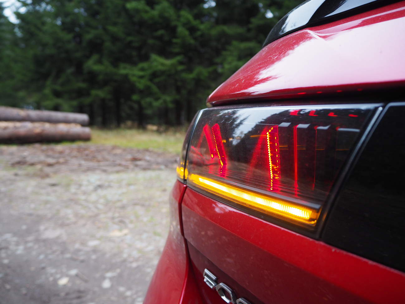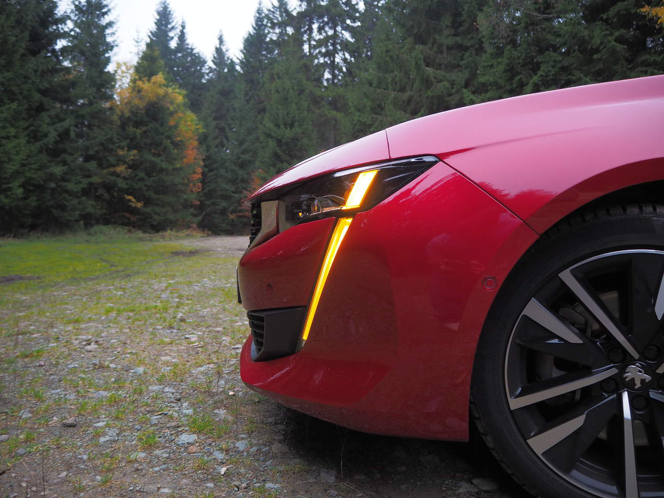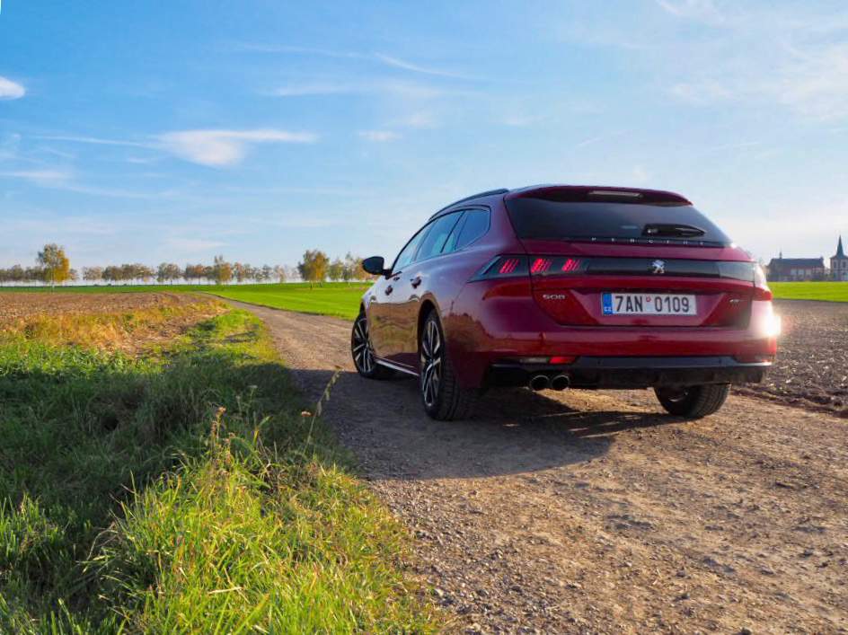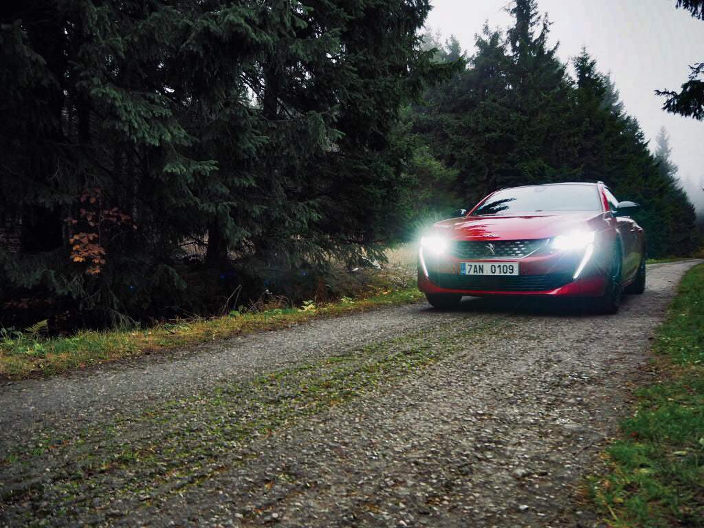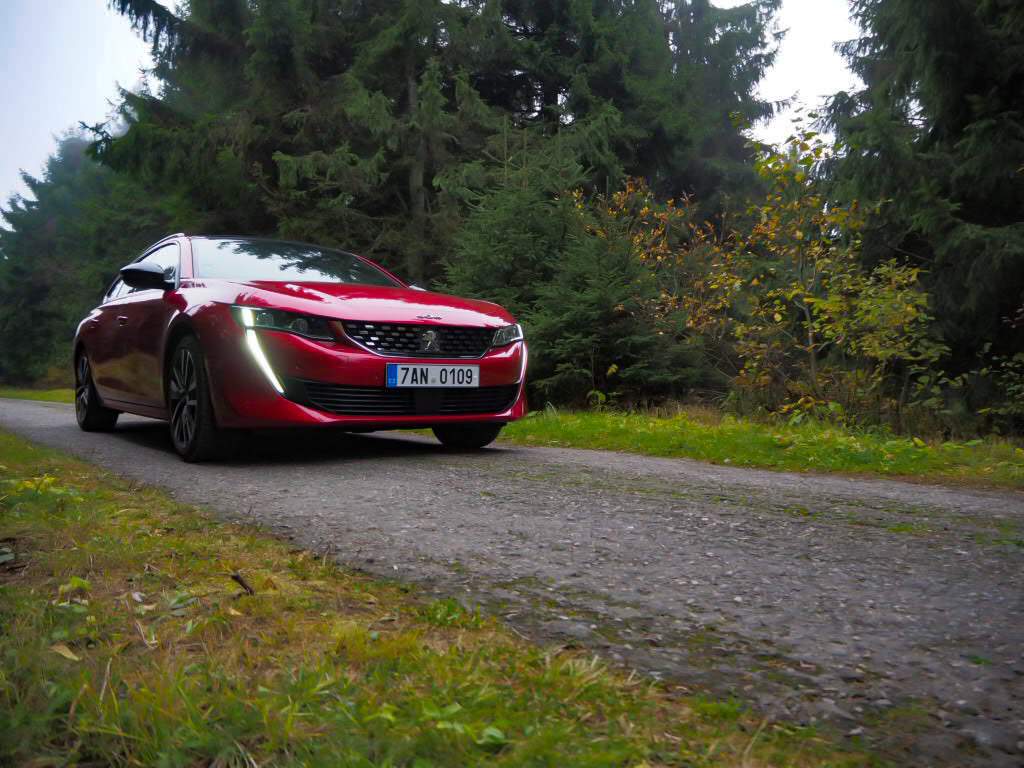 K testu jsem si vypůjčil červený kus ve verzi kombi. Osobně mám radši základní provedení s karoserií liftback, nicméně přes ten cool vzhled se tu pořád bavíme o autě střední třídy, jaké používají zákazníci z řad rodin, praktičtější varianta si proto jistě zaslouží pozornost. Na první pohled zaujme nízká stavba auta a jeho tesáky. Jinak nejnápadnější prvek na přídi Peugeotu popsat neumím. Značka přišla před časem s novým designovým jazykem, který přiostřil vzhled všech Peugeotů. Přibyly hrany a zuby. Když rodinný Peugeot 5008 dostal malé špičáky lehce tvarující přední světla, byla to jen lehká předzvěst toho, co mělo přijít později. A teď je to tu. Tesáky denního svícení, které zároveň fungují jako blinkry, pokračují směrem dolů a div se nezapíchnou do asfaltu. Zadní lampy zase prosvítají z temného kouřového pásku skla na zádi.
