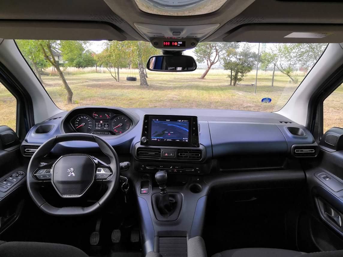 Dokonce i onen často kritizovaný i-cockpit – rozložení ovladacích prvků vozu, kdy jsou budíky přístrojové desky situovány nad malý volant – tady dává smysl. Možná dokonce větší, než v osobních modelech Peugeotu. Malý volant je umístěný nízko a díky tomu není příliš dodávkově naplocho, budíky nad ním jsou zarovnané s hranou předního skla a protože se tu sedí trochu jako na židli, pozoruje je řidič pěkně shora. Řadící páka s dlouhými a poněkud neurčitými drahami je pak po ruce poměrně vpředu ve vyvýšeném středovém tunelu, ruční brzda dostala podobu malého tlačítka a tak nepřekáží mezi sedadly. Díky tomu se sem nastěhovala obří schránka krytá dvěma shrnovacími roletami, která pojme bez problému třeba tři dvoulitrové pet lahve.