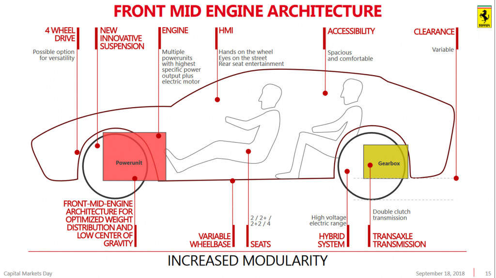 Louis Carey dále prozradil, že ‚Plnokrevník’ bude mít motor umístěný vpředu, ale až za nápravou, přičemž DSG převodovka najde místo pod zadními sedadly. Poháněná budou všechna čtyři kola. Jakým to bude způsobem, zatím Ferrari neprozradilo. Některé zdroje naznačují, že se dočkáme propracovaného systému 4LM jako v modelech FF a GTC4 Lusso.