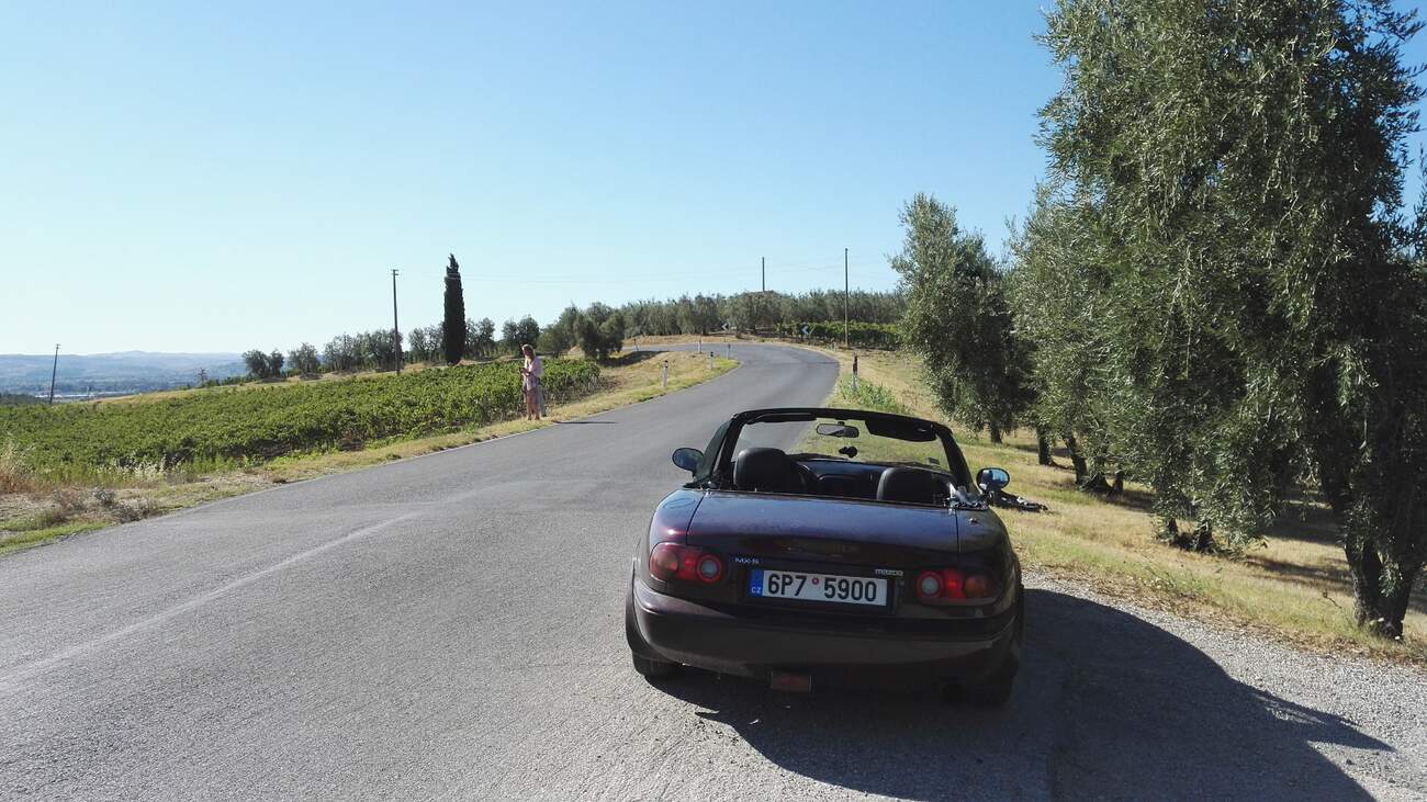 Západ slunce, vůně vína a obrysy historického San Gimignana, obchodní křižovatky toskánského středověku. Rozhled 360 stupňů kolem dokola je ráj. Ještě je tu pohled nahoru: nebe. Zbytek je kůň. Řidič je jezdec. Právě si plníte sen. Projíždíte roadsterem Itálii. Gratuluju.