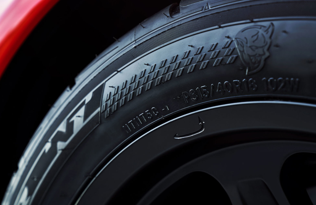 Jenže u typu gum to nekončí. Na všech čtyřech kolech budou obuty salámy o rozměru 315/40 R18, čímž si Demon připisuje další prvenství. Bude totiž autem s vůbec nejširšími předními gumami ze sériové výroby. Gumy jsou vpředu i vzadu stejně široké patrně kvůli tomu, aby se daly mezi sebou prohazovat. Nakonec do toho všeho perfektně zapadá i malé logo Demon, které si Dodge nechá vylisovat na bočnici každé gumy. Proč? Asi to bude mít co dělat se satanismem…